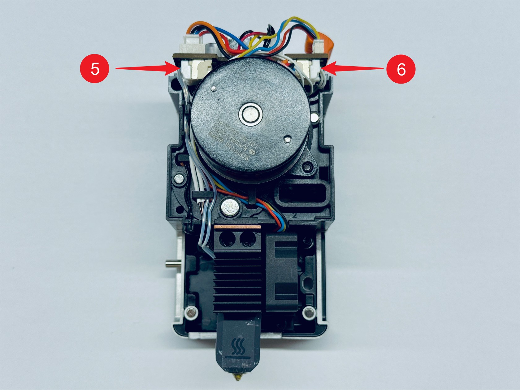 Use an H1.5 hex key to unscrew the 2 fixing screws and sequentially remove the filament runout sensor—2, the driven extruder assembly—3, and the driving extruder assembly—4