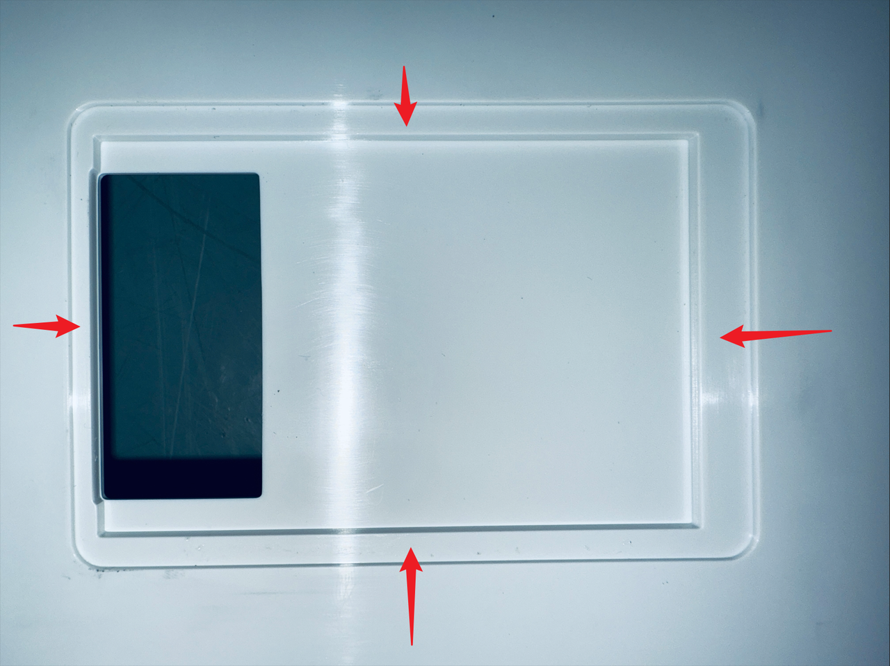 The touchscreen is located between the front panel and the touchscreen back cover. To replace it, please remove the black touchscreen back cover first.