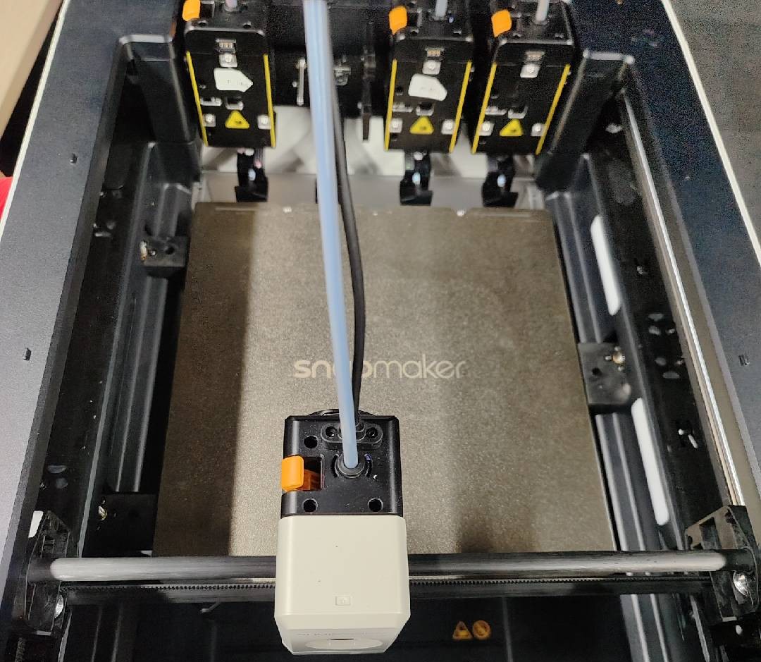 The typical sign is the toolhead positioning itself near the parking location. The filament has now entered the extruder gears. The printer determines if extrusion is successful based on signals from the feeder's mileage wheel and eddy current sensor.