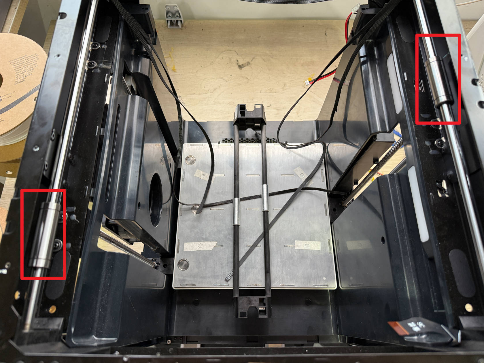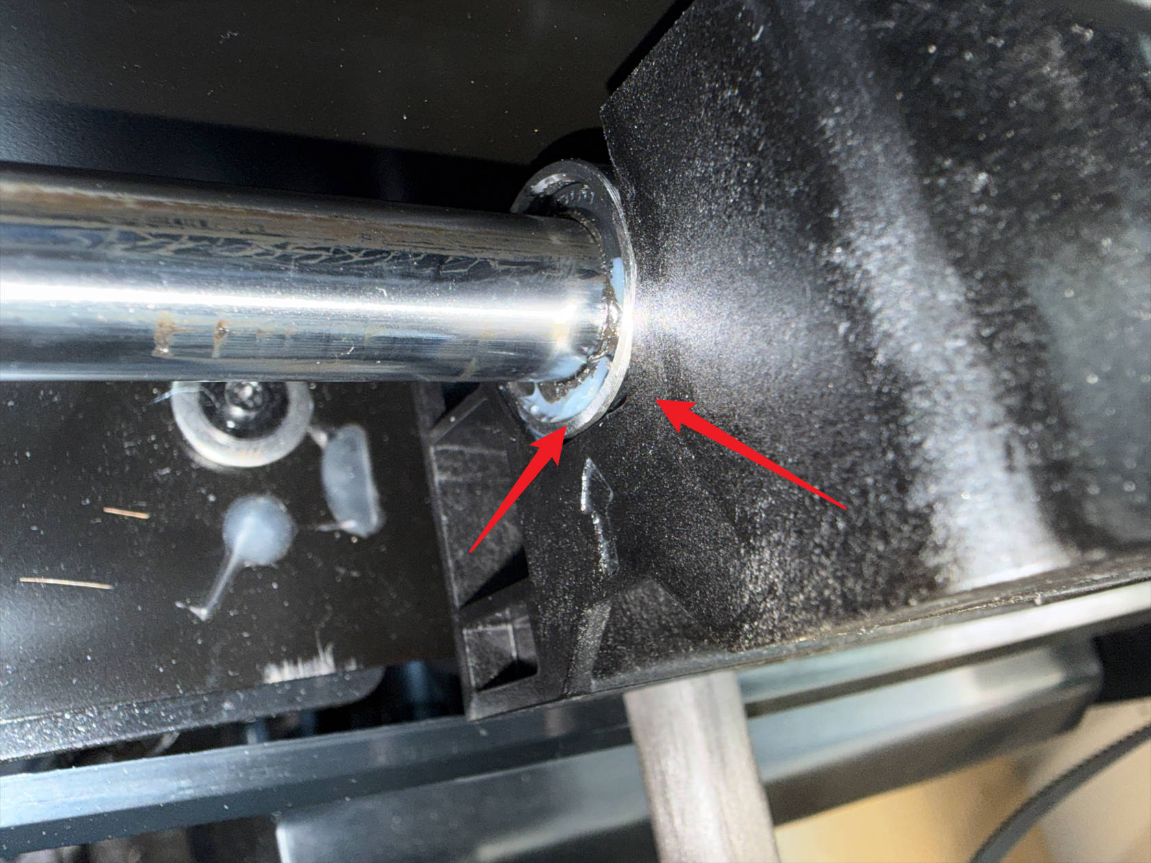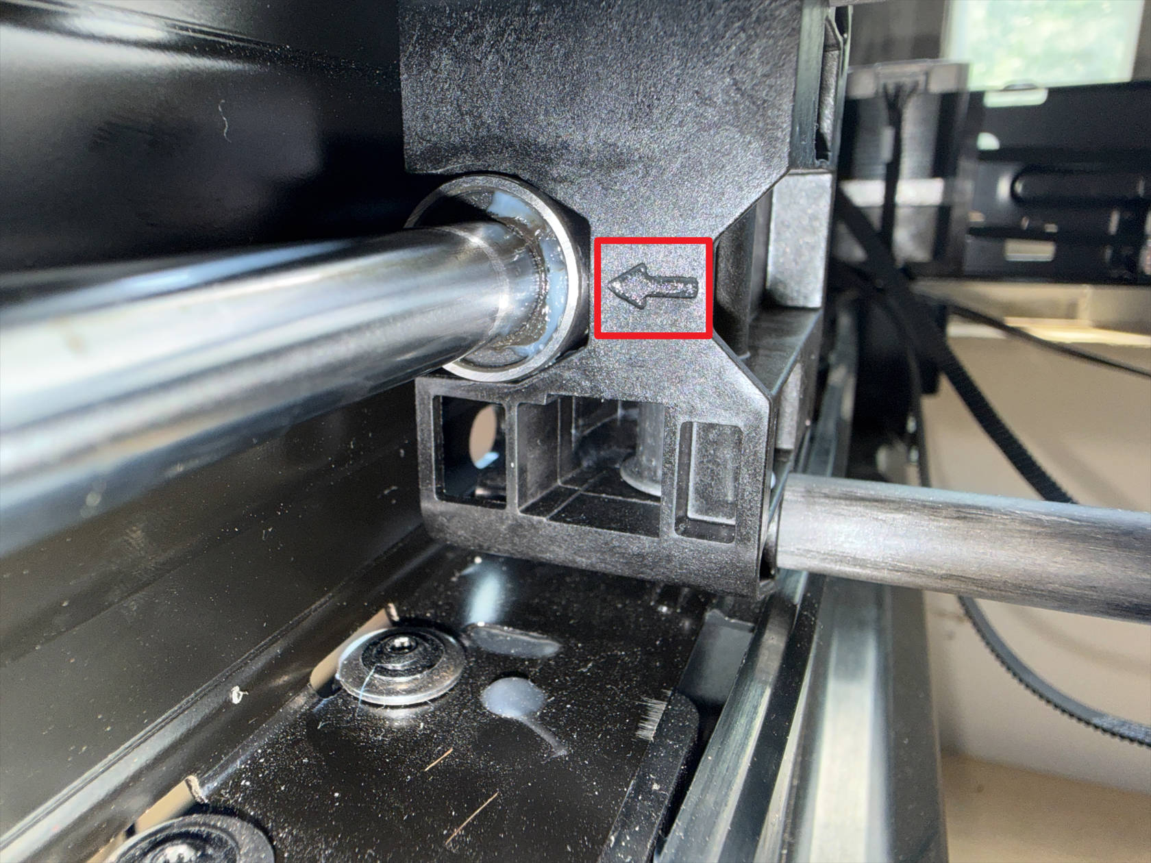 Adjust the carbon rod position so it is perpendicular to the Y-axis, and the Y-axis slider on the carbon rod side closest to the front of the machine is aligned with the linear bearing