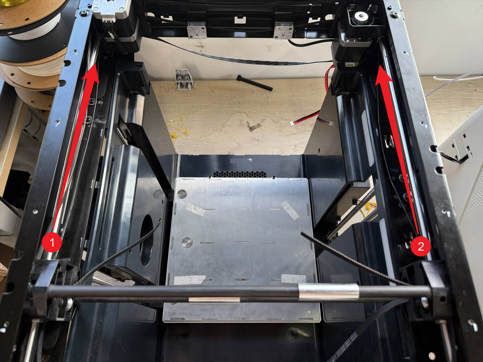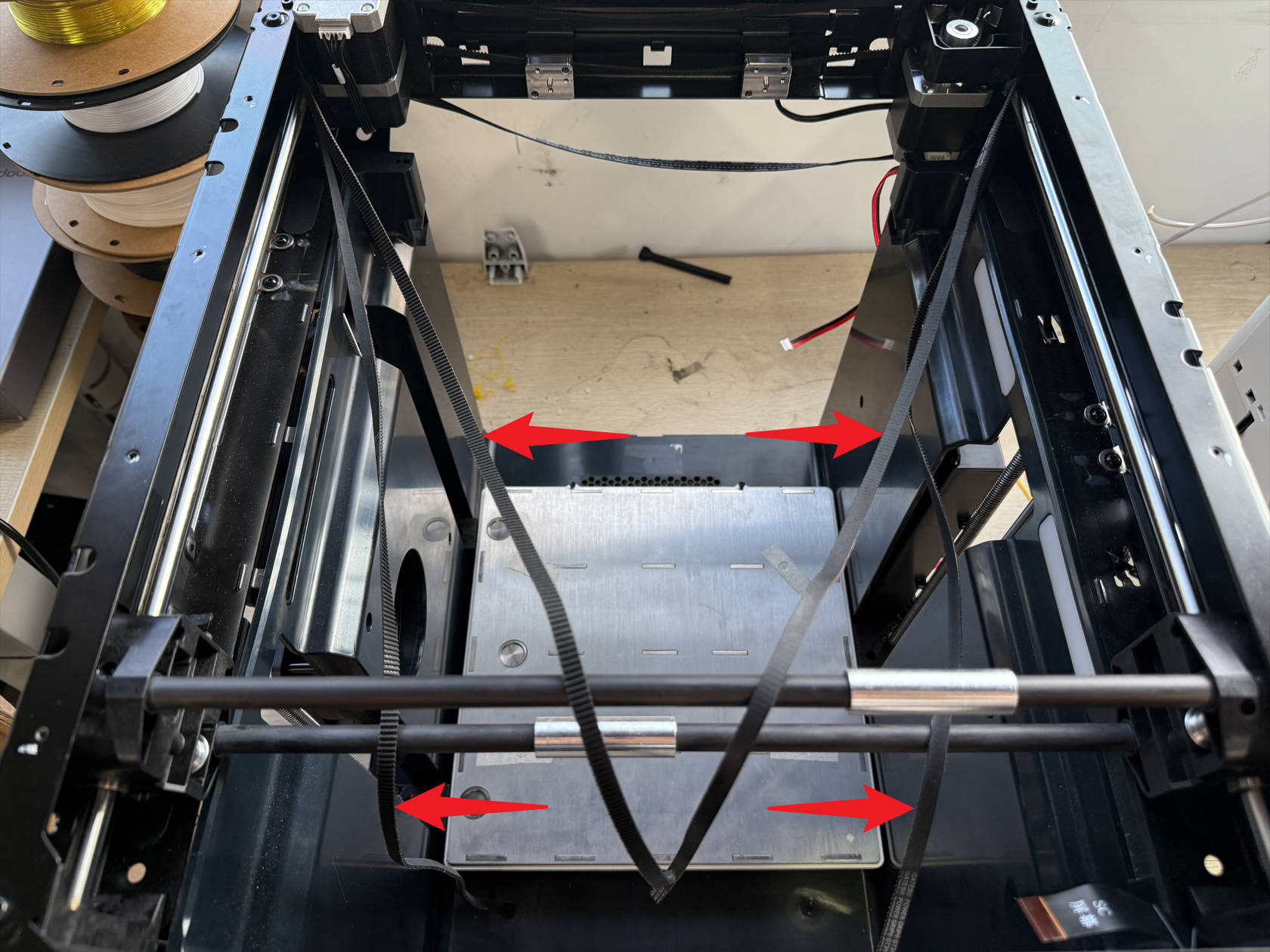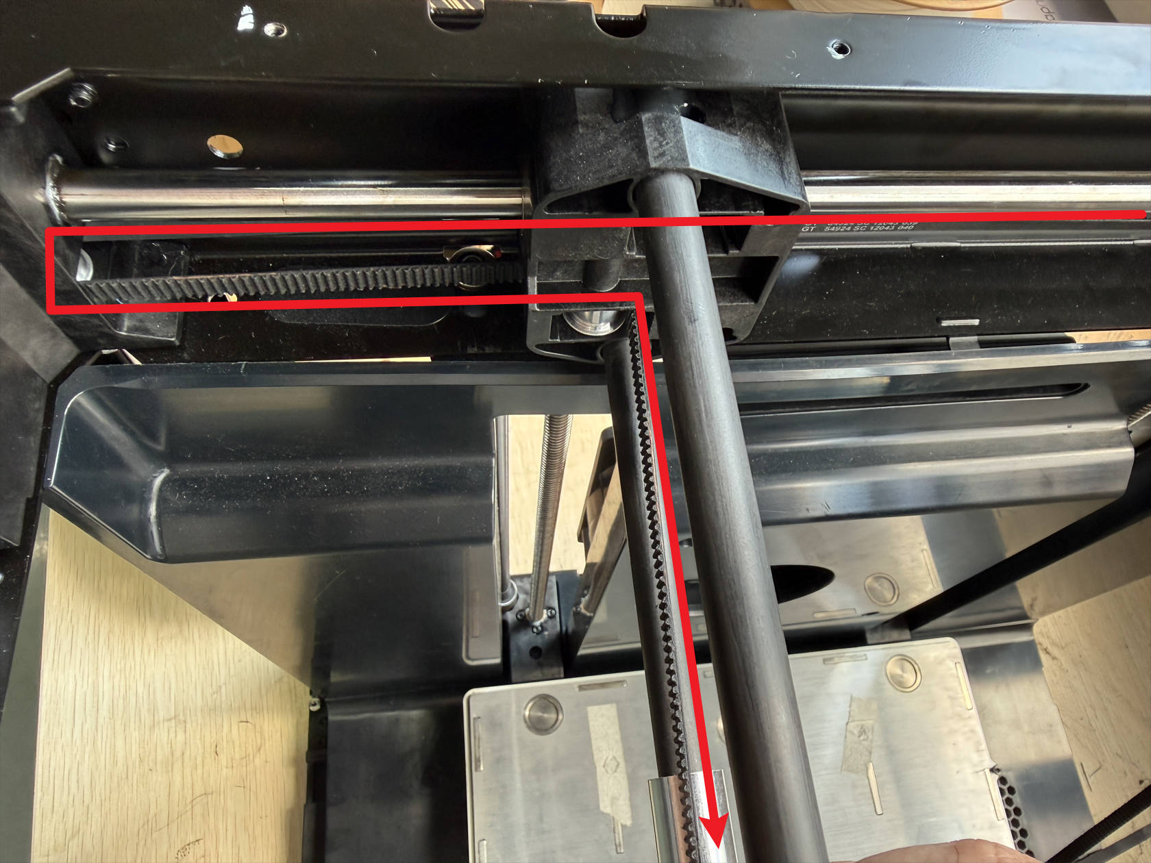 The XY timing belts are divided into upper and lower belts, remove both ends of each belt simultaneously from points 1 and 2