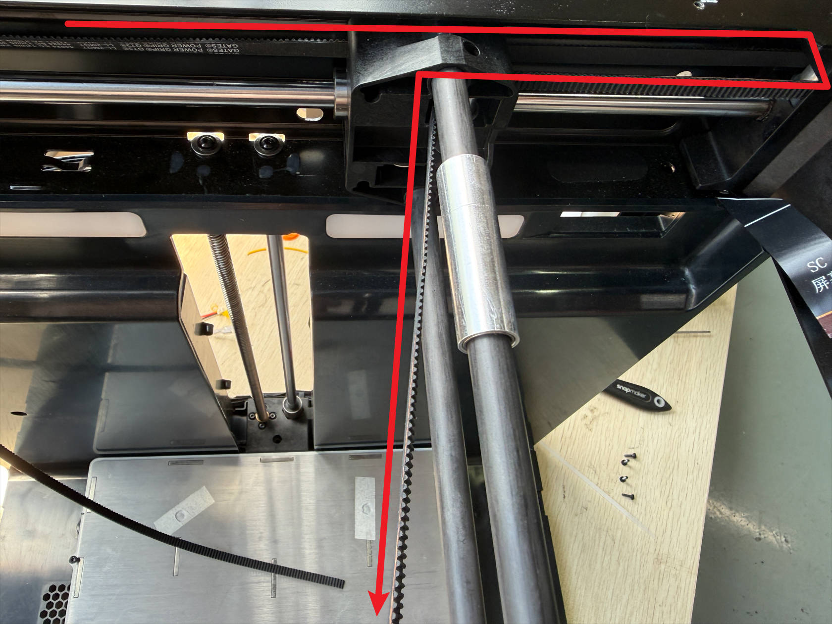 Pass one end of the released timing belt through the illustrated position, keep X-axis slider-2 stationary, straighten and tension the timing belt