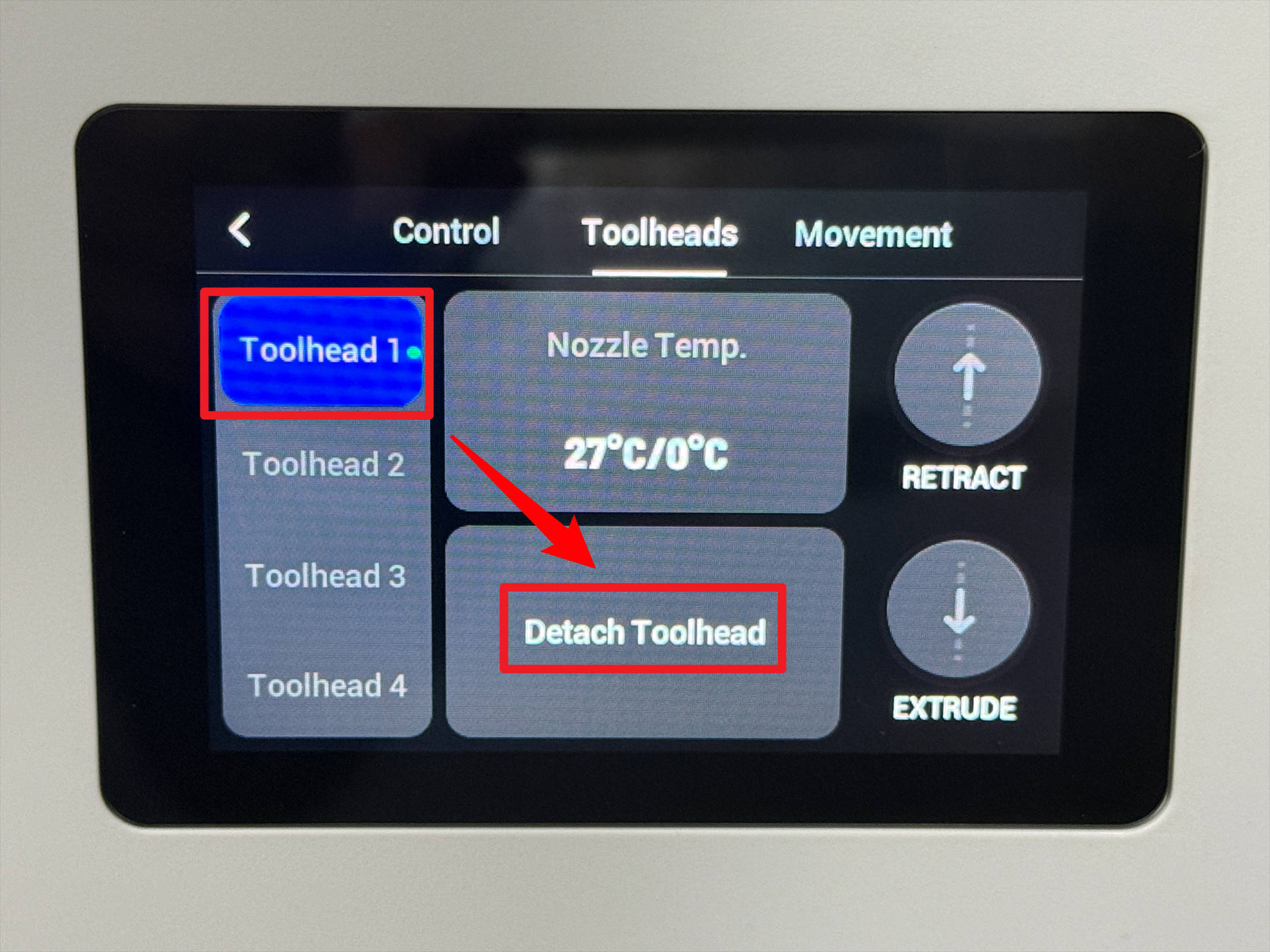 (1) Select the toolhead currently attached to the swapper then tap "Detach Toolhead".