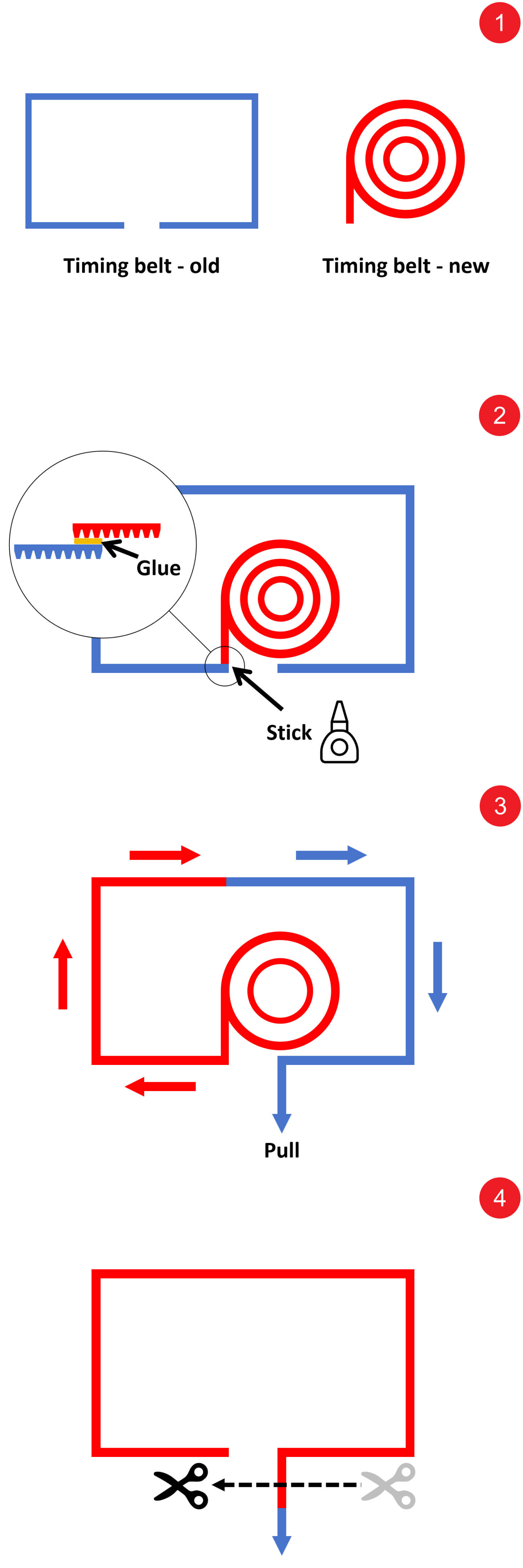 (5) Glue new timing belt to one end of the old one (make sure the teeth face the same direction). After the glue dries, pull the other end of the old belt until the new belt comes through. Finally, cut off the joint between the old and new belts with scissors.