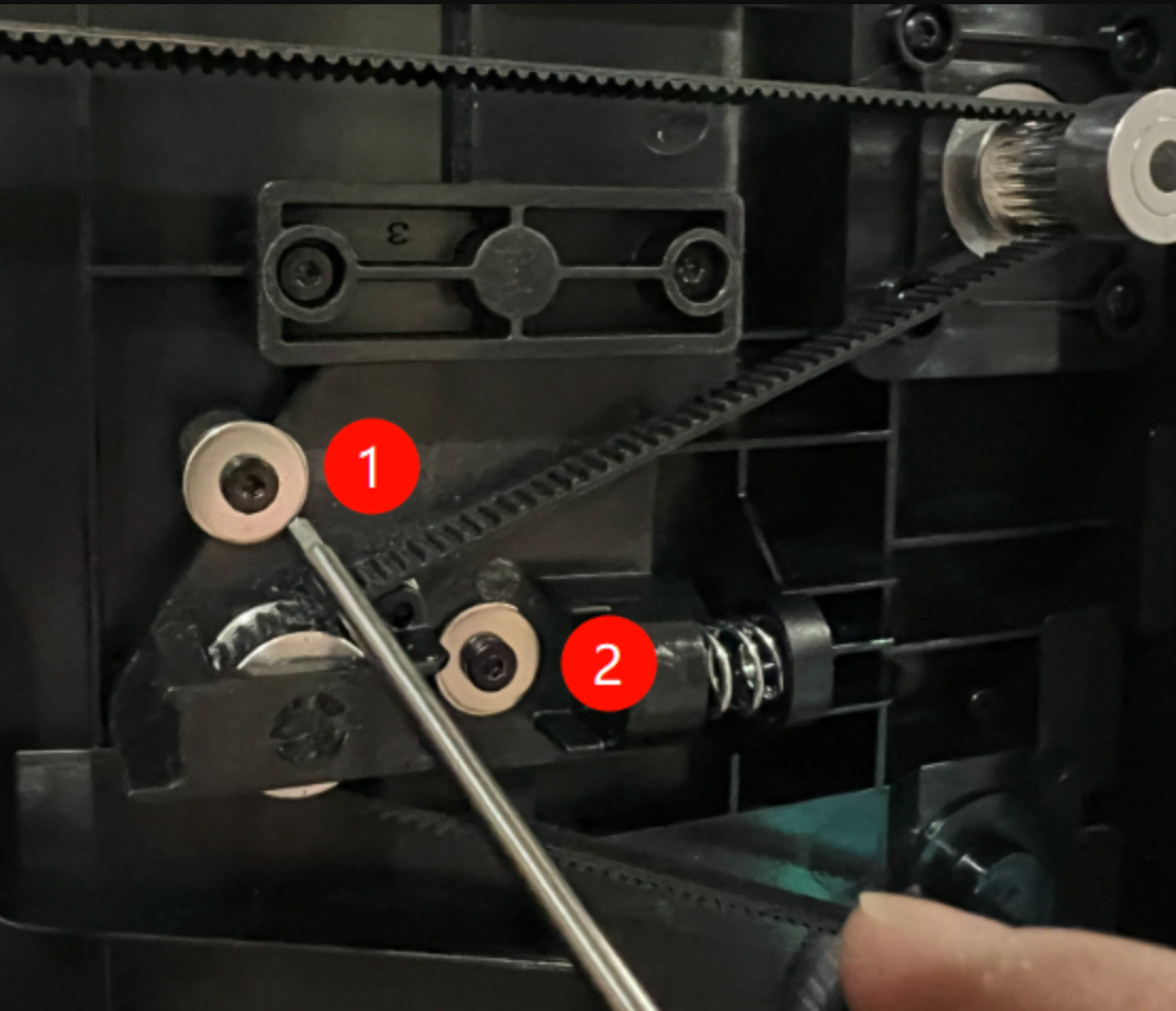 In rare cases, the screw at position ① in the image below may become stripped and cannot be tightened properly. This screw serves only an auxiliary fastening role, while the primary fastening is performed by the screw at position ②. Therefore, looseness of screw ① will not affect normal printer operation. In this situation, simply ensure that screw ② is securely fastened.