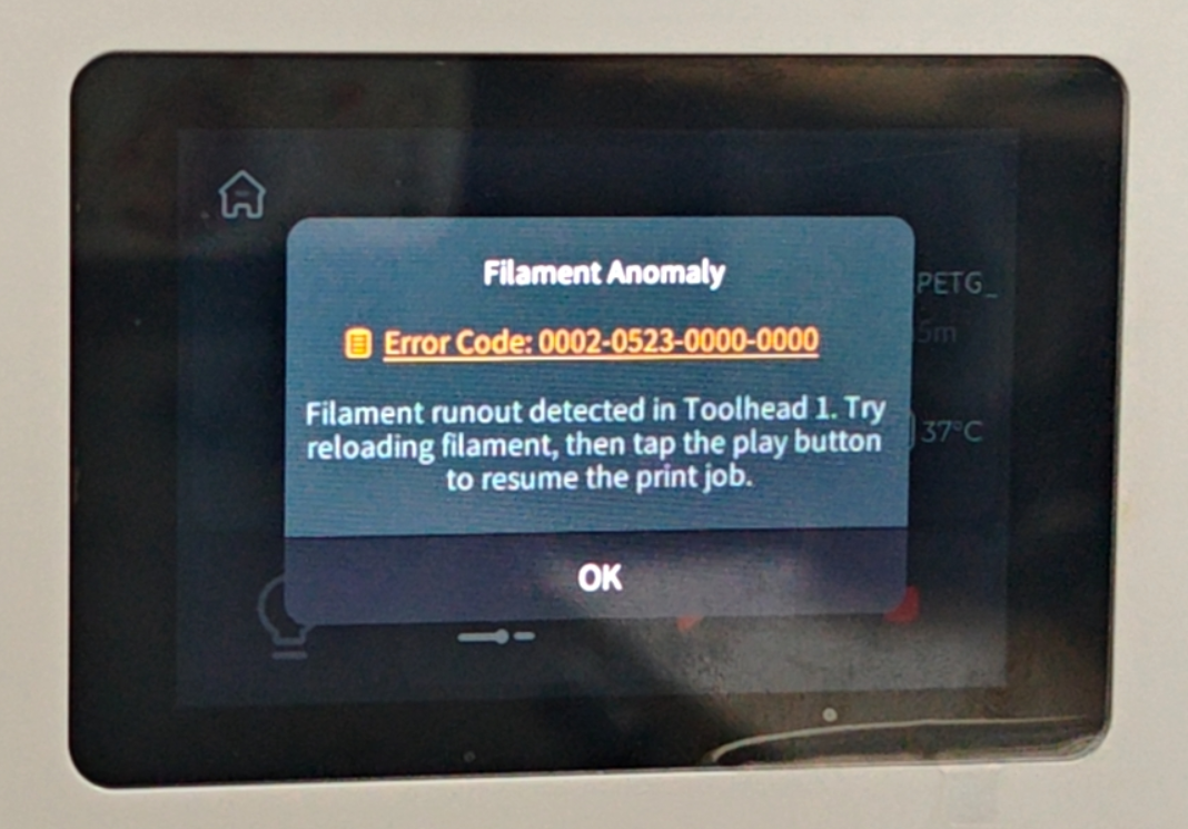 Toolhead 1 filament runout, print paused: 0002-0523-0000-0000