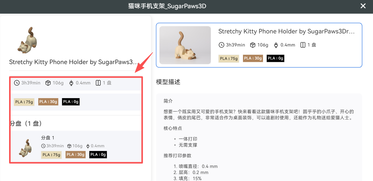 参数配置:当鼠标悬停或点击该区域时,将显示模型的打印时长、喷嘴直径、推荐耗材、分盘情况等信息。