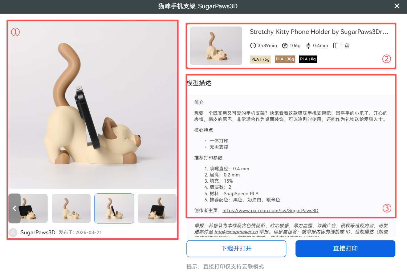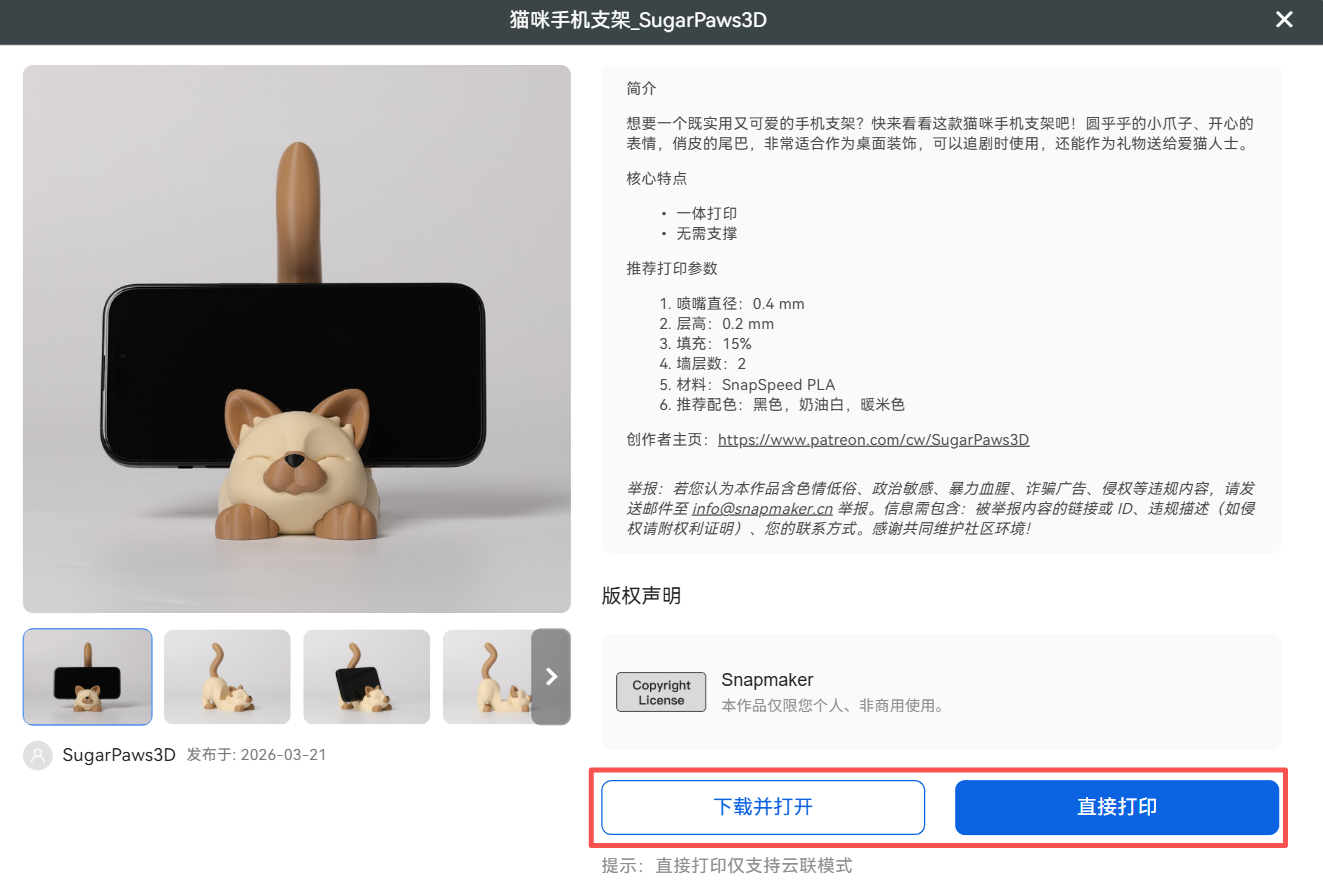 下载并打开:点击此按钮后,将下载模型的 3MF 文件并自动在软件中打开。你可以在准备页面根据实际需要或偏好修改打印参数。若该按钮显示为灰色,说明模型原作者仅授权分享上传的 G-code 文件。在这种情况下,请选择直接打印。