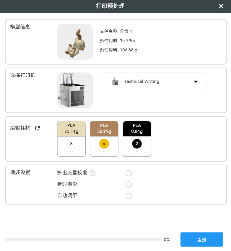 直接打印:使用默认的 G-code 发起打印,不支持自定义打印参数。点击后将进入打印预处理页面。请依次完成选择打印机 > 编辑耗材信息 > 勾选打印偏好 > 点击发送,即可开始打印。直接打印仅支持云联模式,你可以通过 PIN 码或者搜索附近设备的方式绑定打印机与切片软件。