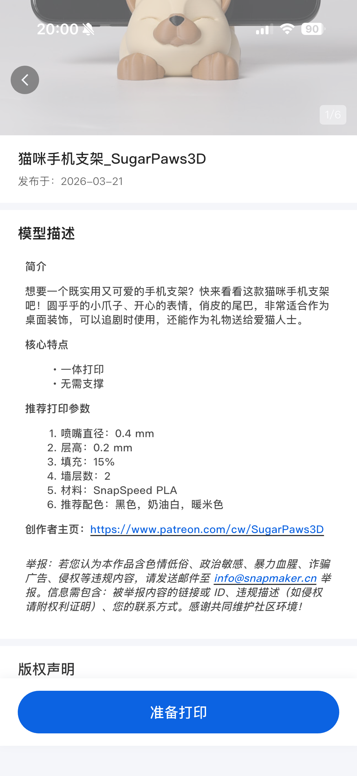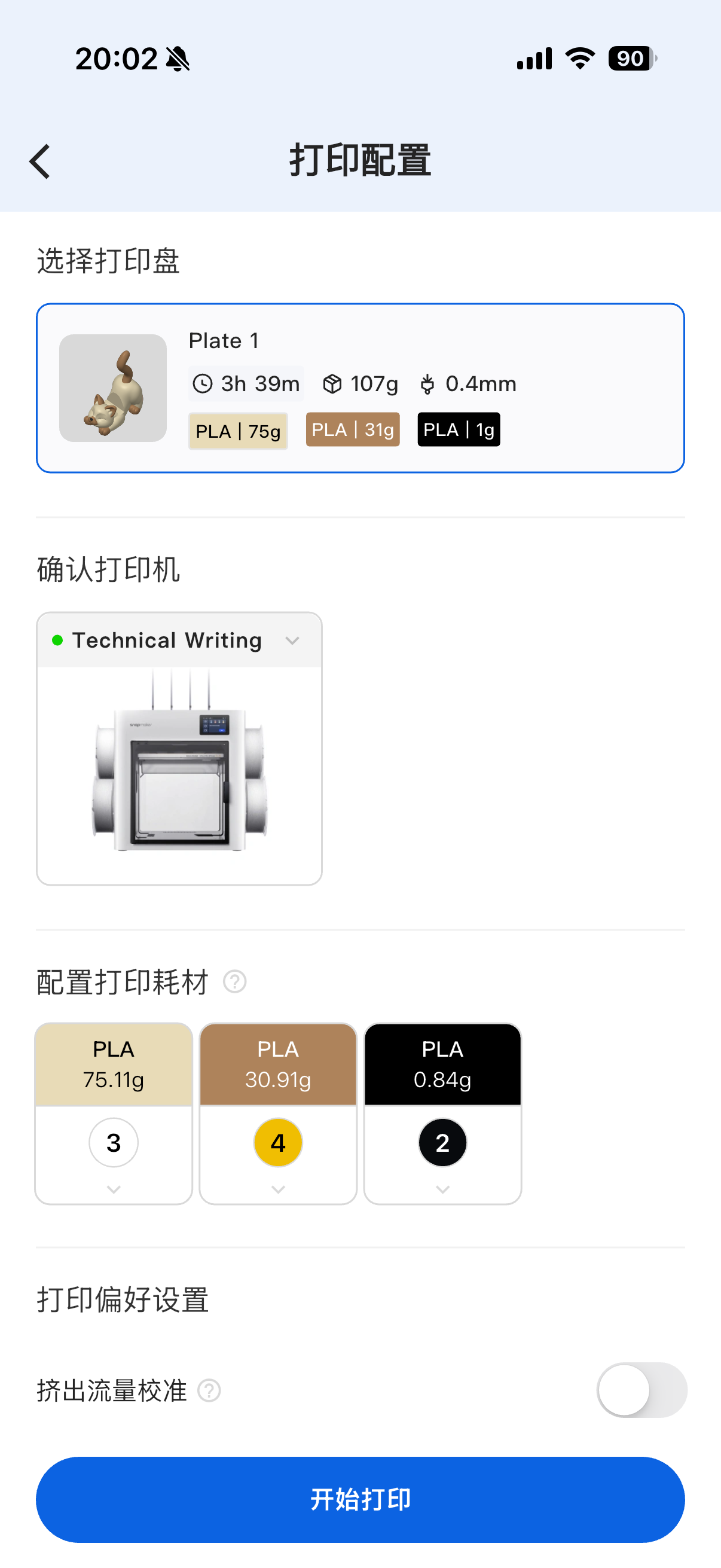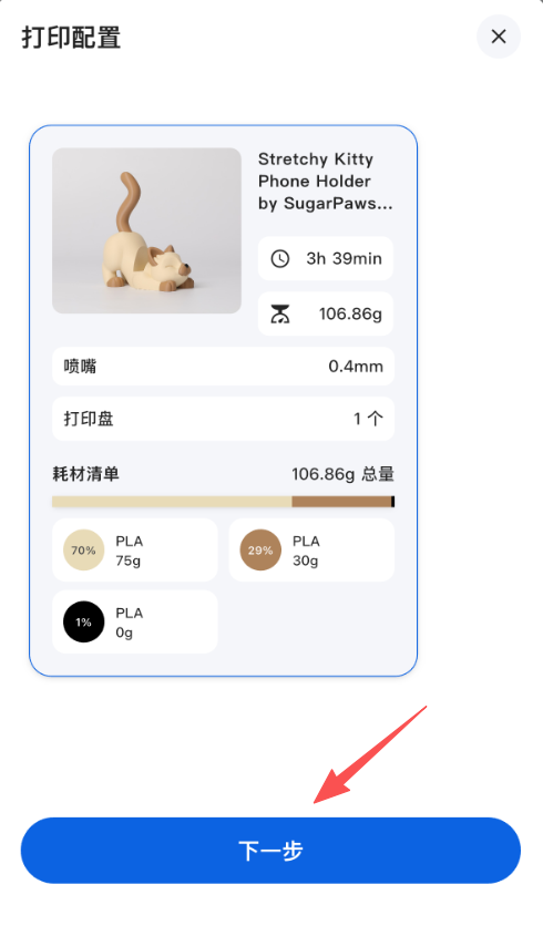 准备打印按钮,页面将显示模型的打印时长、喷嘴直径、推荐耗材、分盘情况等信息。核对无误后,点击下一步。开始打印,即可发起打印。如果你在使用 Snapmaker Orca 的过程中遇到问题,请搜索并关注微信公众号「Snapmaker 快造科技」,在聊天框右下角点击「服务」> 「售后支持」。请将排查结果及相关图片或视频一并发送给售后技术支持,我们将竭诚相助。
