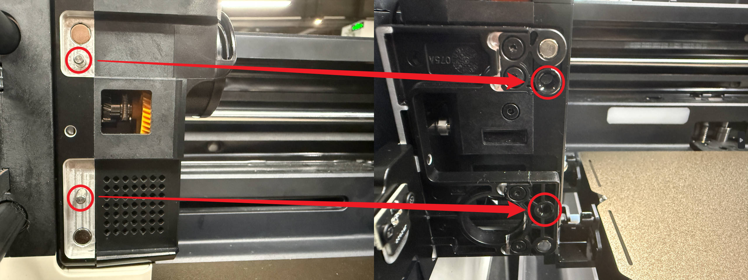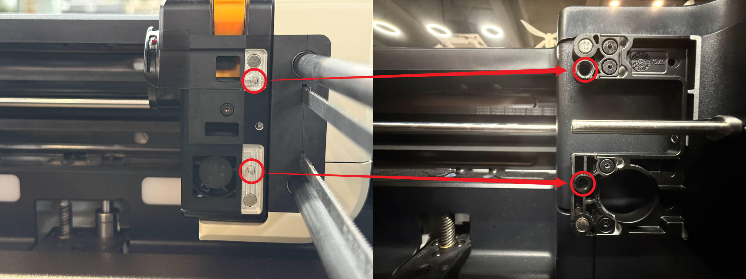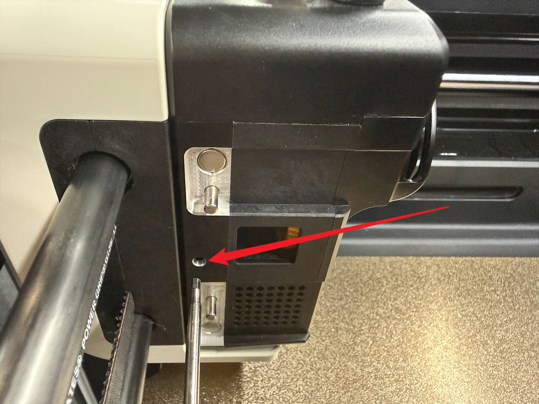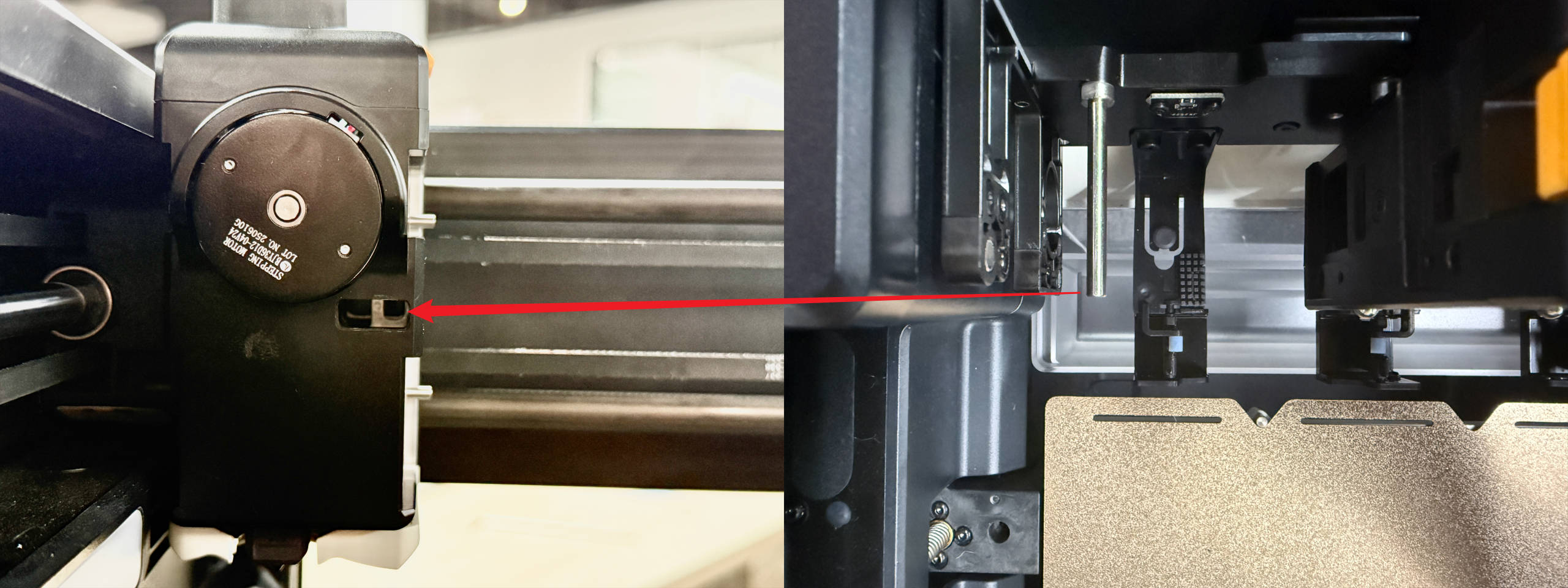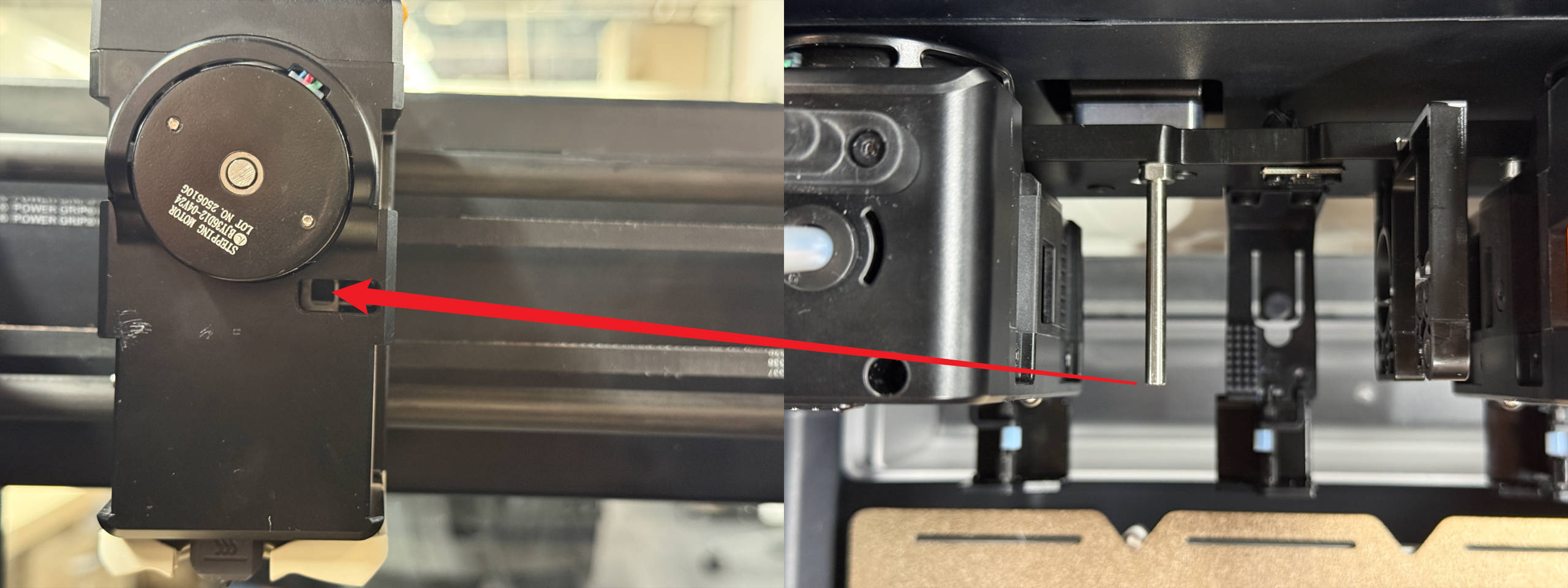 正对机器背面,将执行头孔位右侧对准定位销,保持定位销紧贴其右侧内壁,将执行头和执行头转换器向内推至限位