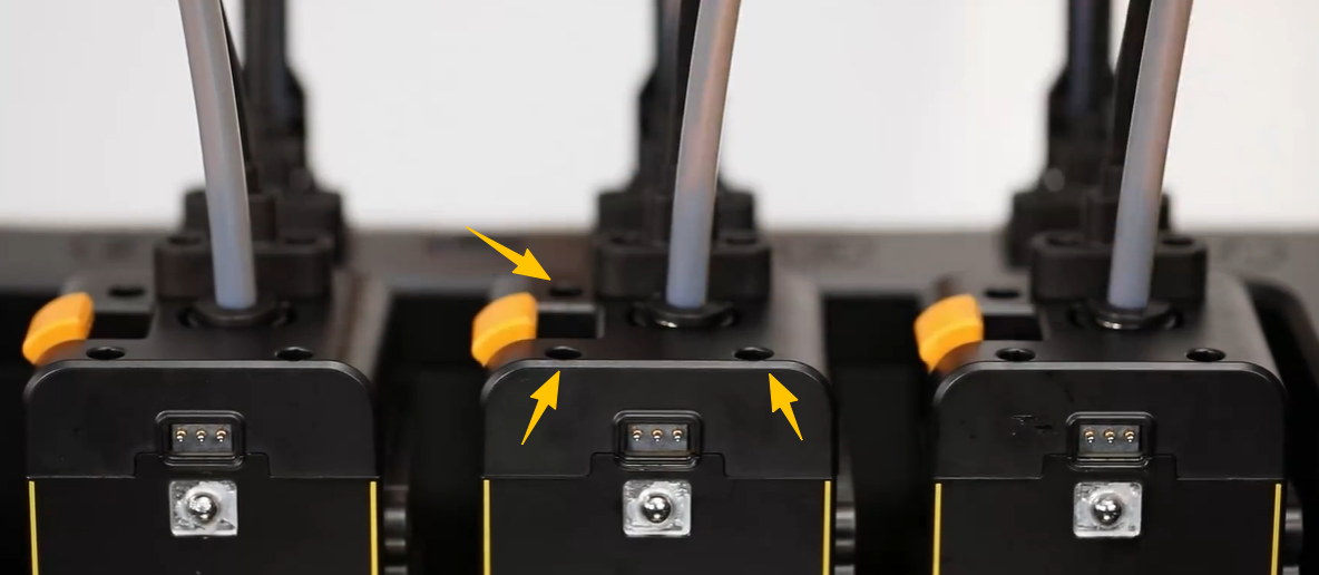 - 使用 H2.0 内六角扳手,拧松图示位置的三颗螺丝,移除打印头顶盖。然后,从停靠位上取下打印头。