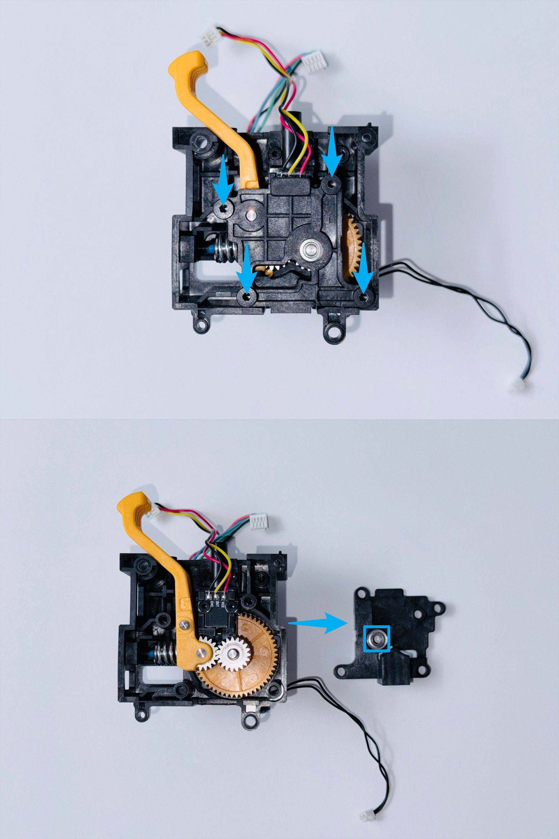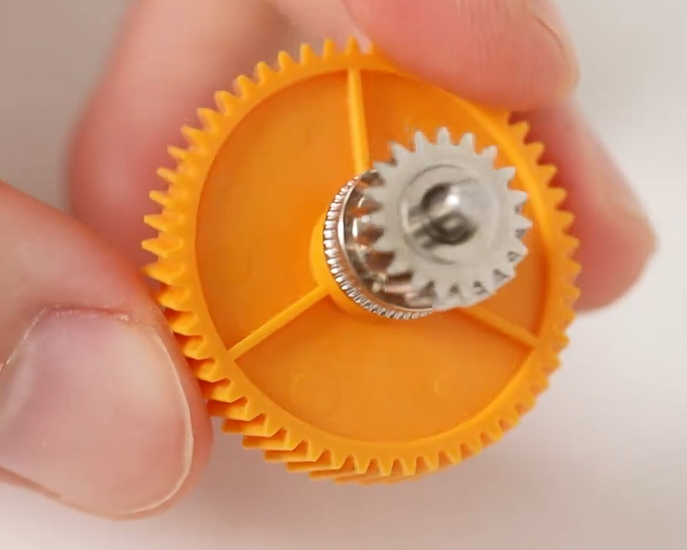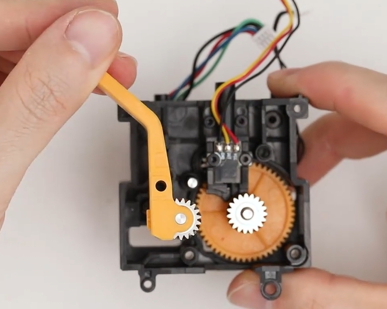 - 如果黄色齿轮转动时,左侧的银色齿轮不动,表明主动挤出轮打滑。你可以联系售后更换主动挤出轮组件,并参照 U1 主动挤出轮组件更换指引完成相应操作;
