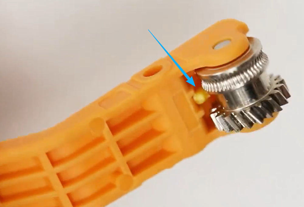 - 主动挤出轮位于打印头的挤出单元内。在初始排查阶段,你无需拆解挤出单元,即可从打印头的右侧看到齿轮的局部细节。
