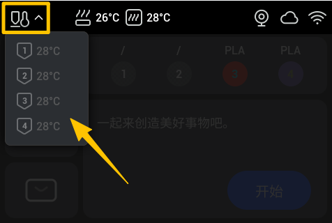 - 退料完成后,在触控屏左上角查看对应喷嘴的温度,当冷却至 40°C 以下时,继续下一步。