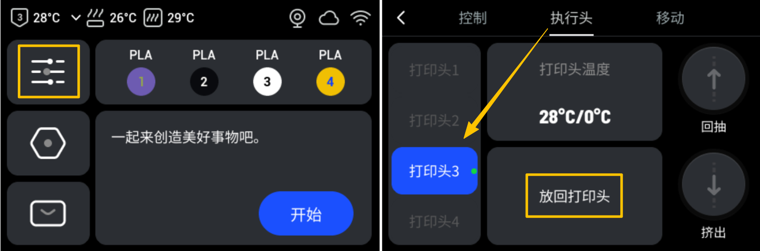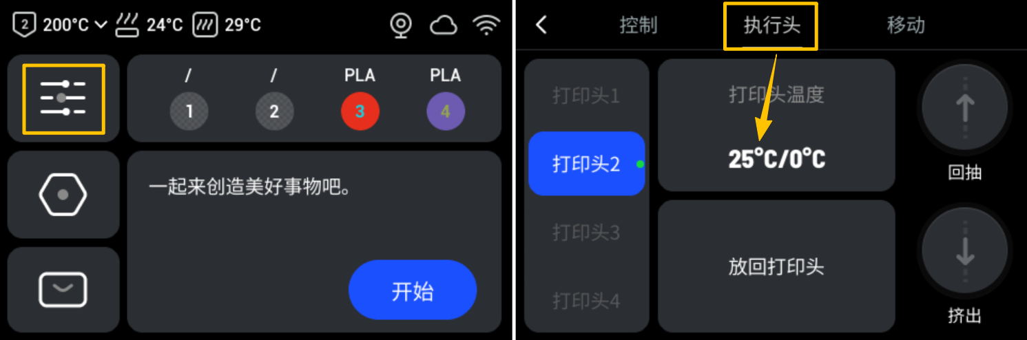 在开始下面的排查步骤前,请先为对应打印头执行退料操作。根据不同耗材的属性,请分别参阅硬质耗材退料或柔性耗材退料。