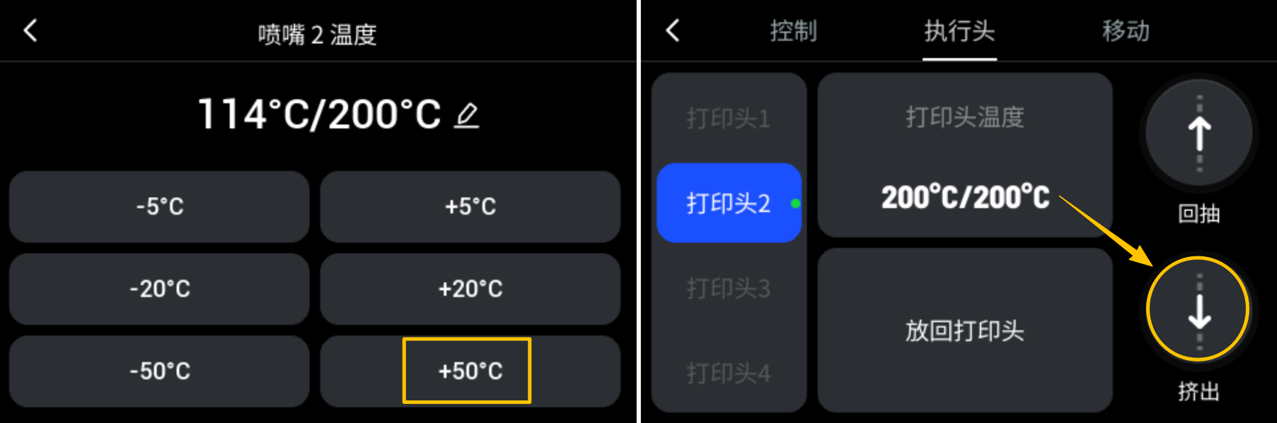 - 将对应喷嘴的温度增加至 200°C,加热完成后返回上一页,点击