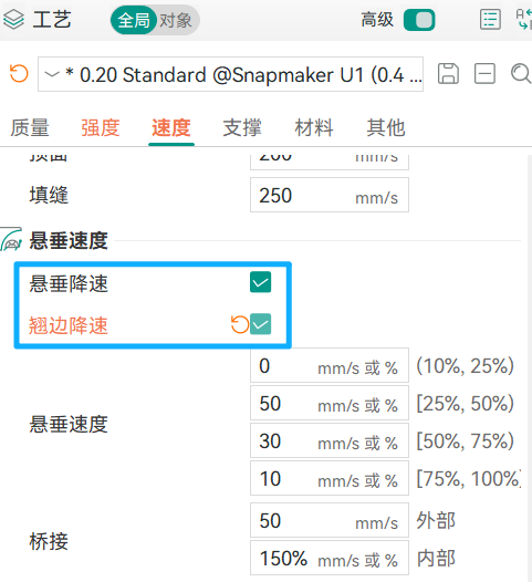 当斜面角度较大或接近悬垂结构时,可以适当降低喷嘴温度,提高部件风扇/辅助风扇转速,并启用悬垂降速和翘边降速,以减少因重力导致的材料下垂现象,从而避免顶层无法有效封合的问题。
