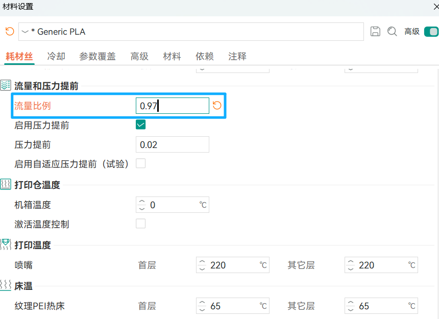 材料设置中,输入最新的流量比例,保存参数。除了提高流量比例外,还可以适当增加外墙和顶面的线宽。
