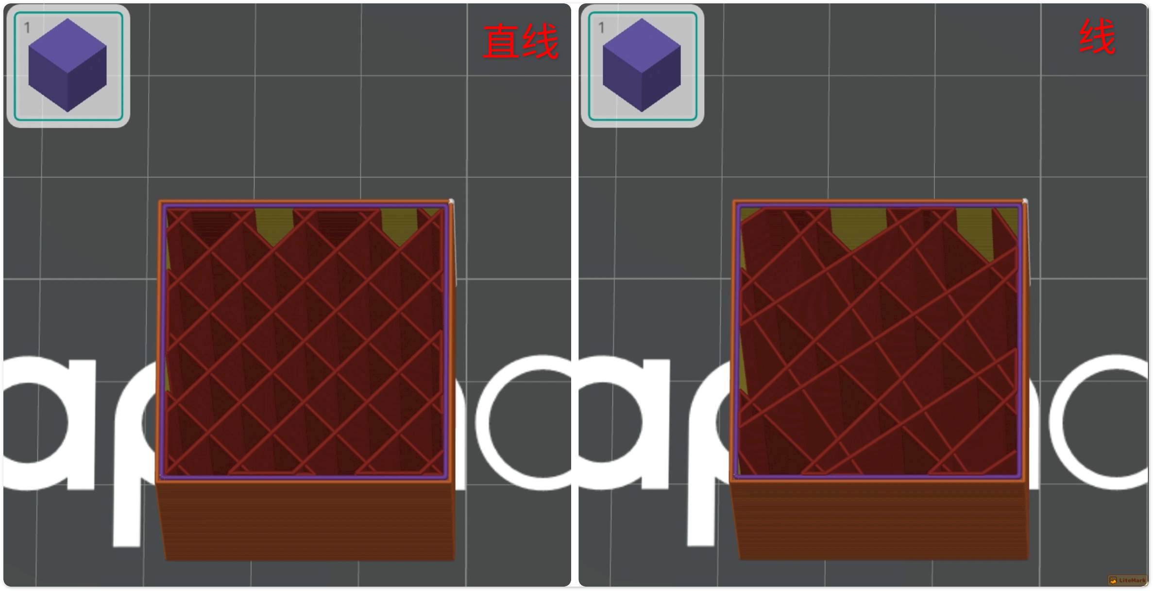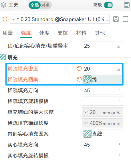 在填充密度相同的情况下,不同的图案将影响强度、柔韧性和打印速度。目前,Snapmaker Orca 提供 26 种稀疏填充图案。虽然最佳图案取决于具体的打印任务及要求,在解决本文提到的缝隙问题时,部分图案仍具备显著优势。比如,当选择稀疏填充图案为线时,由于其线条通过网状交织排布,能够形成更复杂的立体支撑结构,所以比直线填充更稳定,后者打印速度快、耗材消耗少,但是层间结合强度略逊一筹。