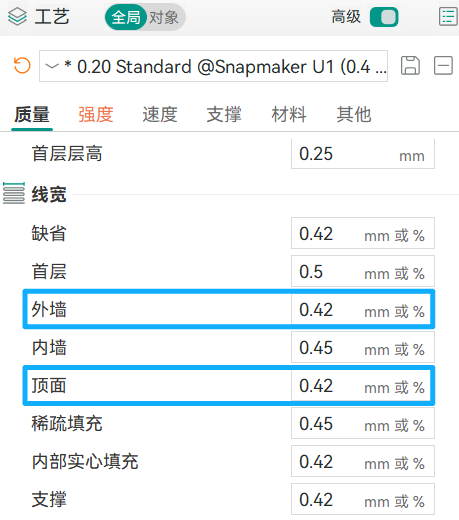 影响可见顶层的打印质量,通常为喷嘴直径的 100%–105%。以 U1 标准 0.4mm 喷嘴为例,顶面线宽的推荐范围为 0.4-0.42mm。在此区间范围内,既能实现平滑效果,又能避免过度挤出。