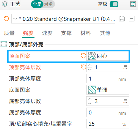 顶面填充图案可尝试同心、单调或单调线,这类图案在小区域和不规则轮廓上更容易填满缝隙。