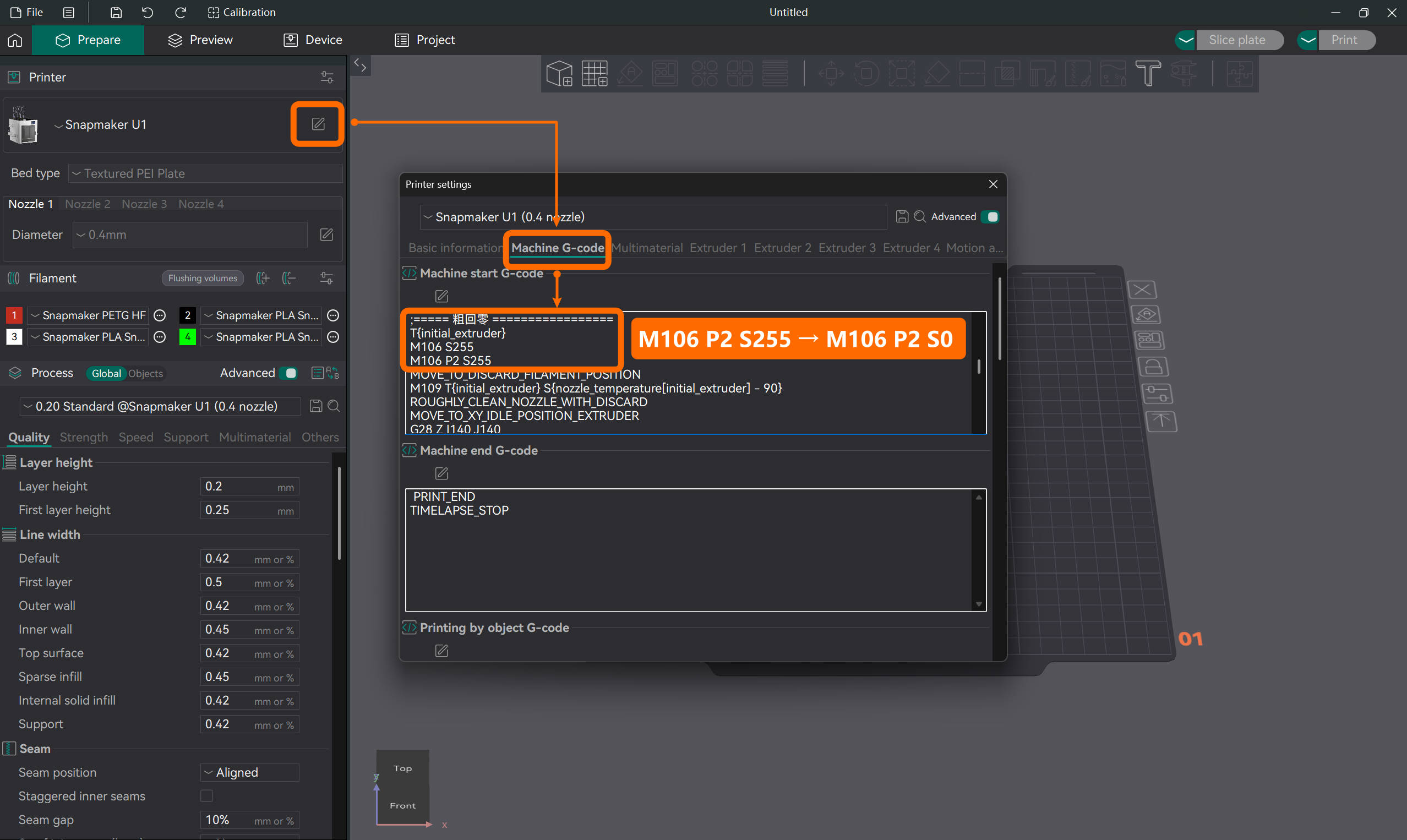 2. 在Snapmaker Orca中,修改机器起始G-code。