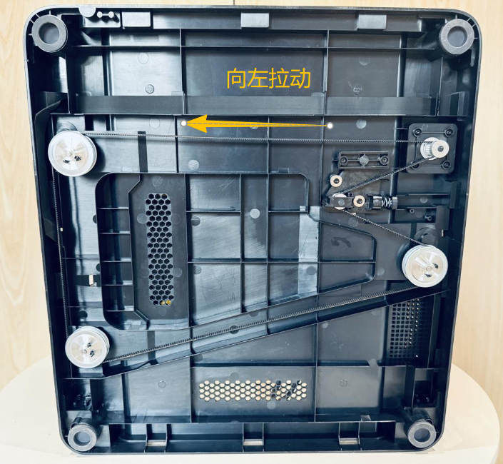 以均匀且稳定的力度向左侧拉动同步带,此时可以观察到热床在缓慢抬升。同时,用内六角扳手插入空转的螺丝,保持扭力并尝试旋出螺丝。