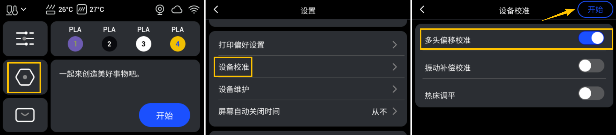 设备校准 > 点选多头偏移校准,并按照屏幕提示完成操作。为保证打印质量,我们建议你: