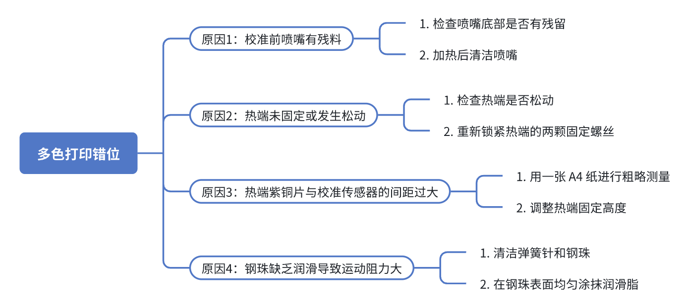 多头打印的核心原理在于建立各打印头之间精确的坐标偏移量。因此,当你在使用 U1 进行多色打印时,如果出现以下问题,通常与多头偏移校准数据不准确或机械状态异常有关,可参考本指南进行故障排查: