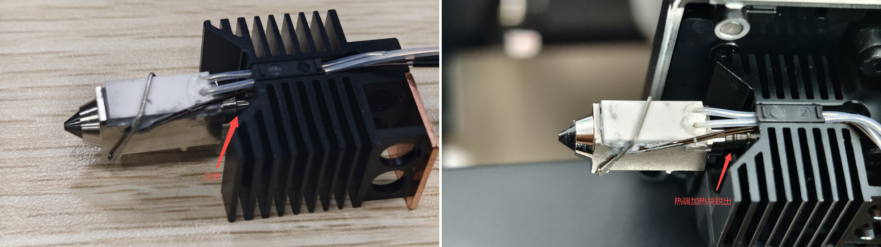 - 移除喷嘴外侧的黑色硅胶套,对比下图观察加热块是否脱出。