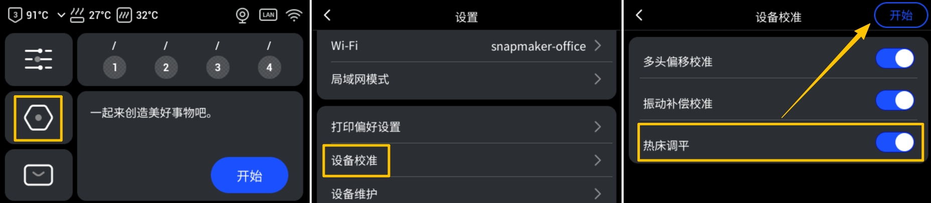 - 完成手动调平后,请运行自动热床调平:返回设置页 > 点击
