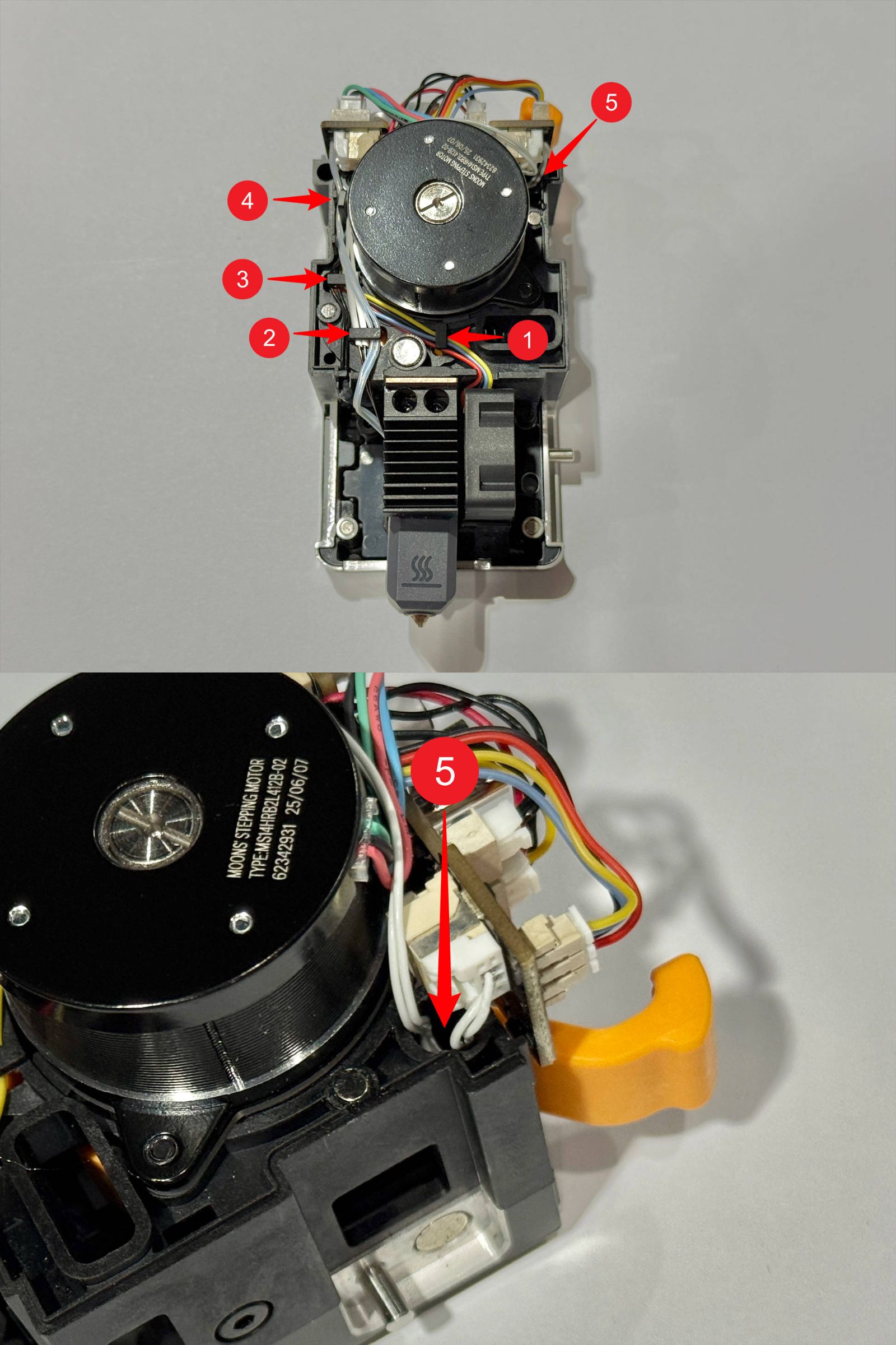 (7) 按图示指引理线,注意在5处热敏电阻线多余部分需压入挤出单元孔内。