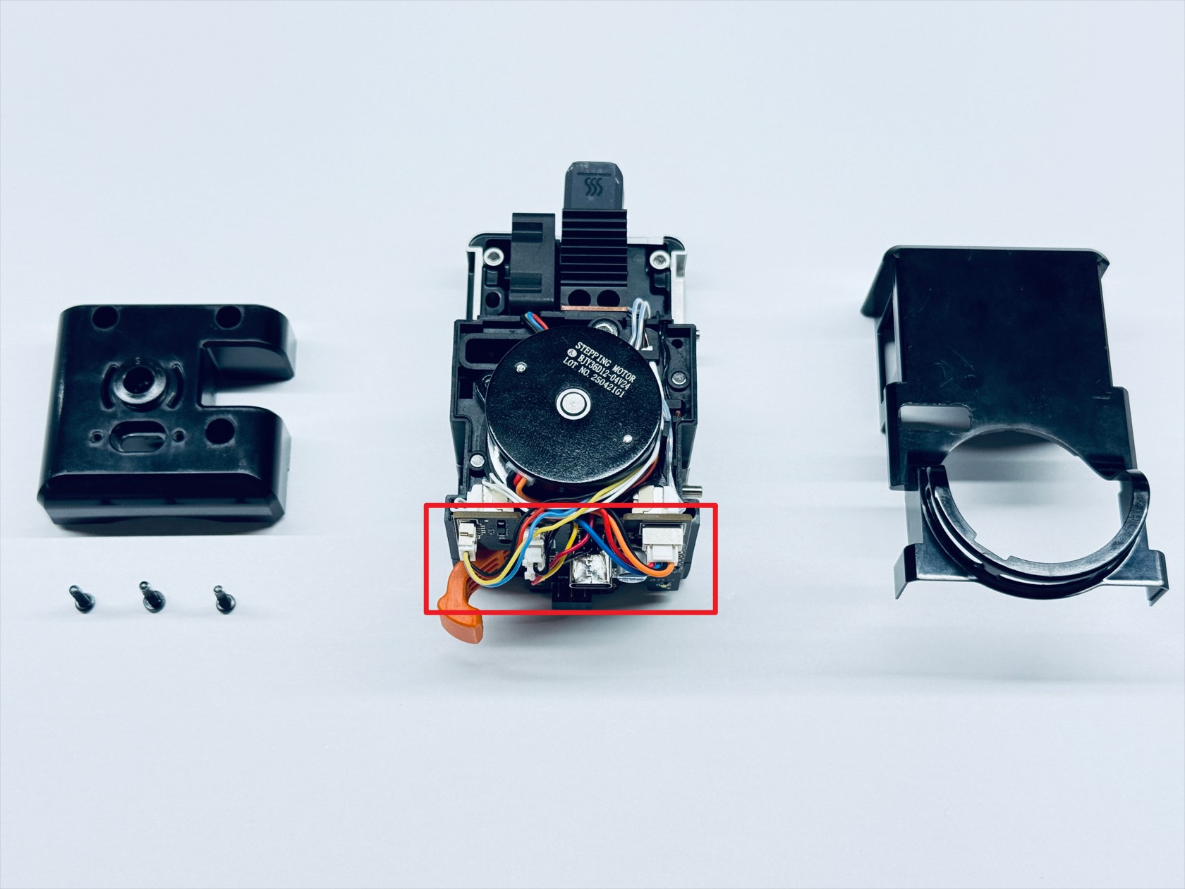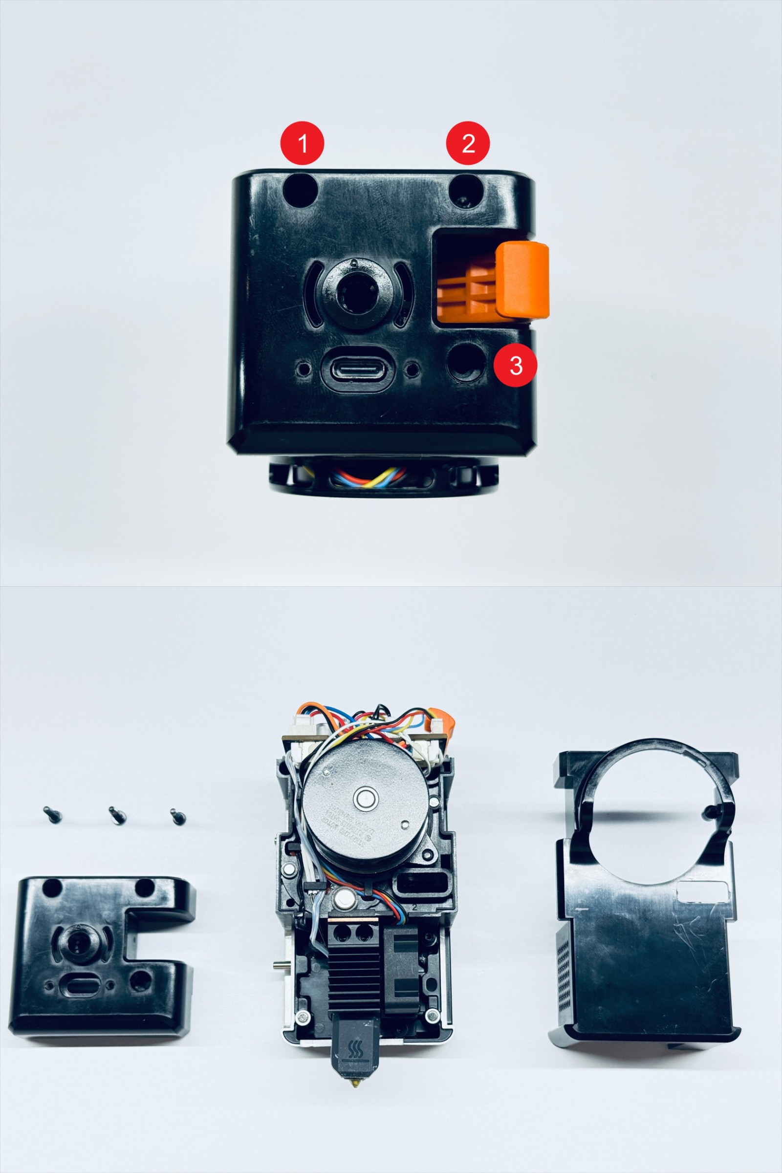 (1) 使用H2.0内六角扳手拧出3颗固定螺丝,拆除执行头上盖板和后盖板。