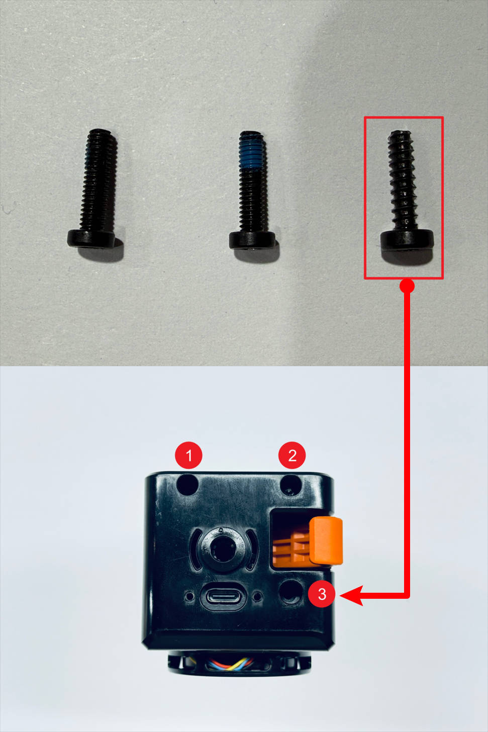 (1) 安装执行头上盖板和后盖板,使用H2.0内六角扳手锁紧上盖板3颗固定螺丝,注意:其中一颗规格不同的需装在3处。