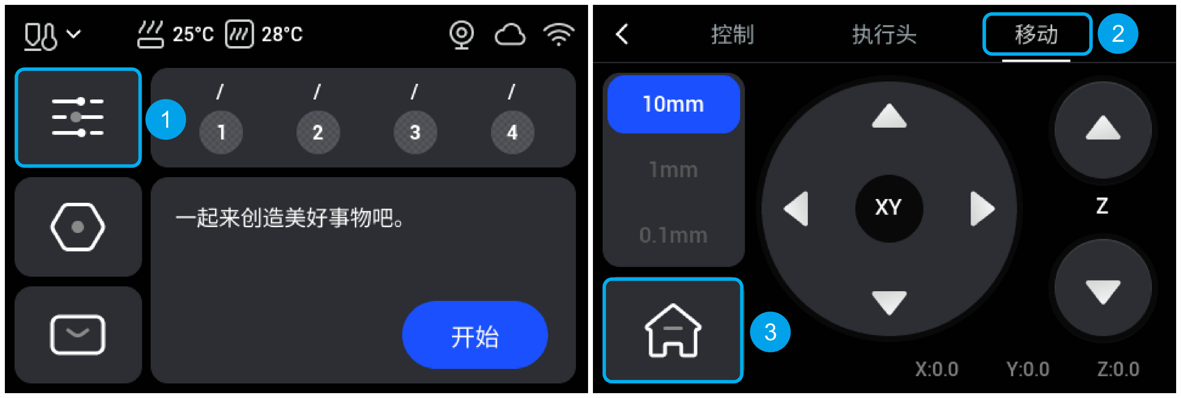 1. 如何确定取放头位置:机器回零完成后,会在当前水平面生成一个 X—Y坐标系,抓取每个打印头时,打印头转换器会移动到对应的坐标位置。