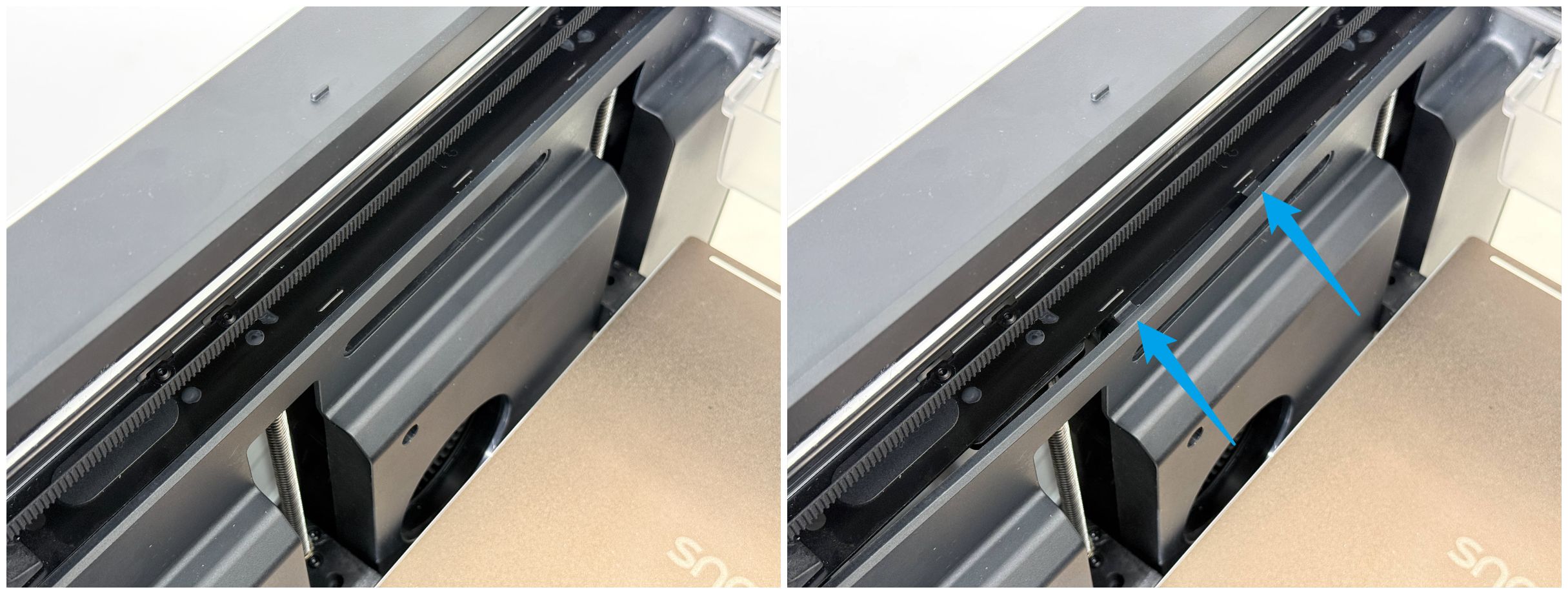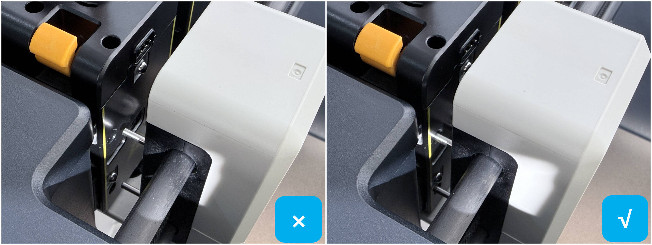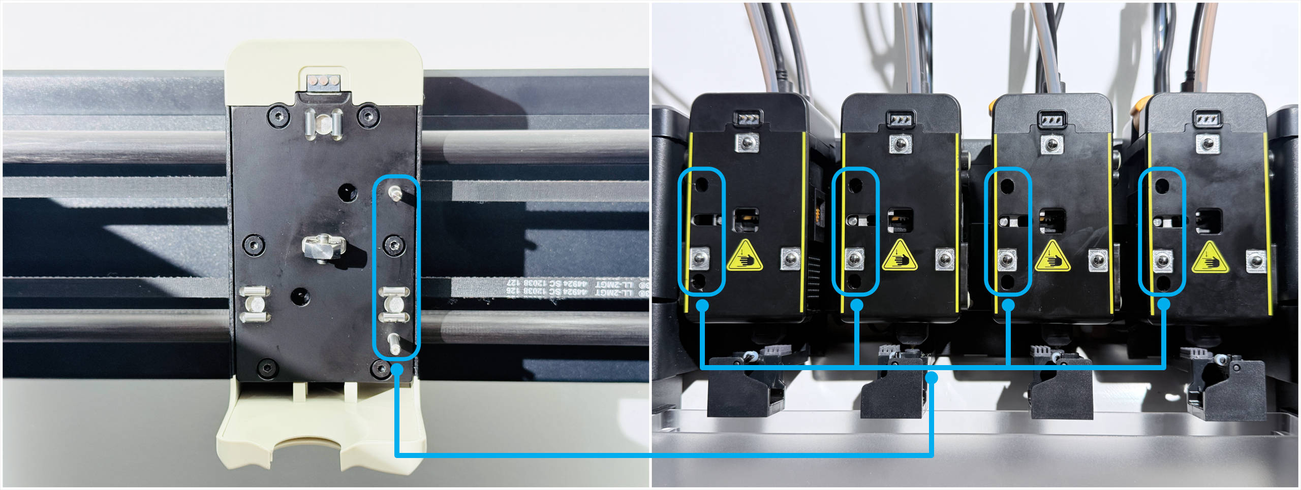 2. 打印头和打印头转换器如何固定:移动到取放头坐标位置后,打印头转换器会向左/右移动,使拉钉与拉栓对接锁紧。