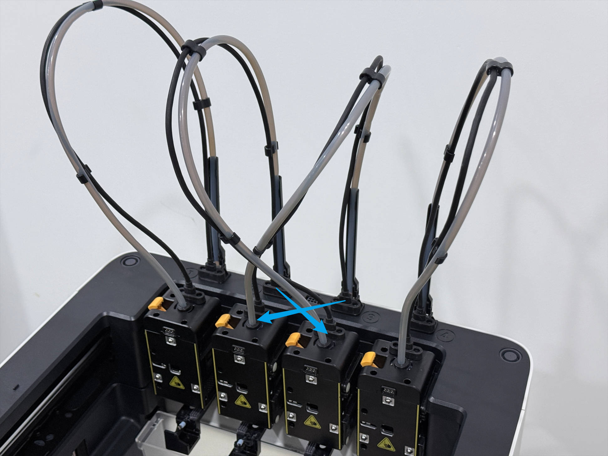 1. 打印头安装位置错误:打印头未正确停靠在对应的放置架上,表现为导料管/打印头转接线交叉。