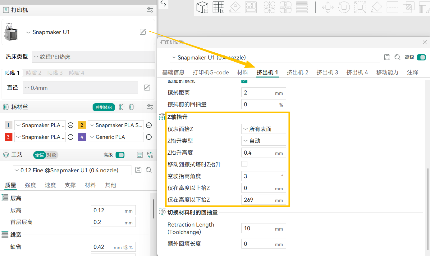 在 Snapmaker Orca 中,点击打印机右侧的编辑按钮 > 选择对应挤出机 > 启用 Z 轴抬升。这会让喷嘴在模型内部移动时自动抬升一小段距离,可以有效防止喷嘴碰撞模型。