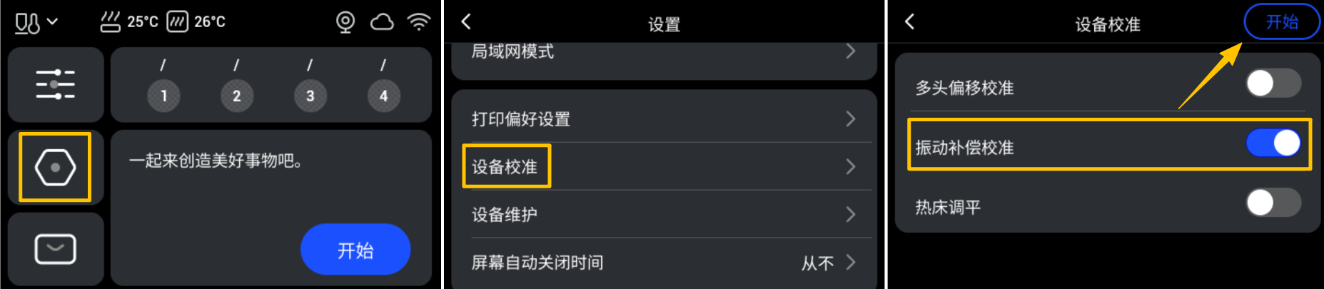 完成同步带张力调节后,我们建议你进行振动补偿校准。在触控屏主界面点击进入设置页 > 设备校准 > 启用振动补偿校准 > 开始。