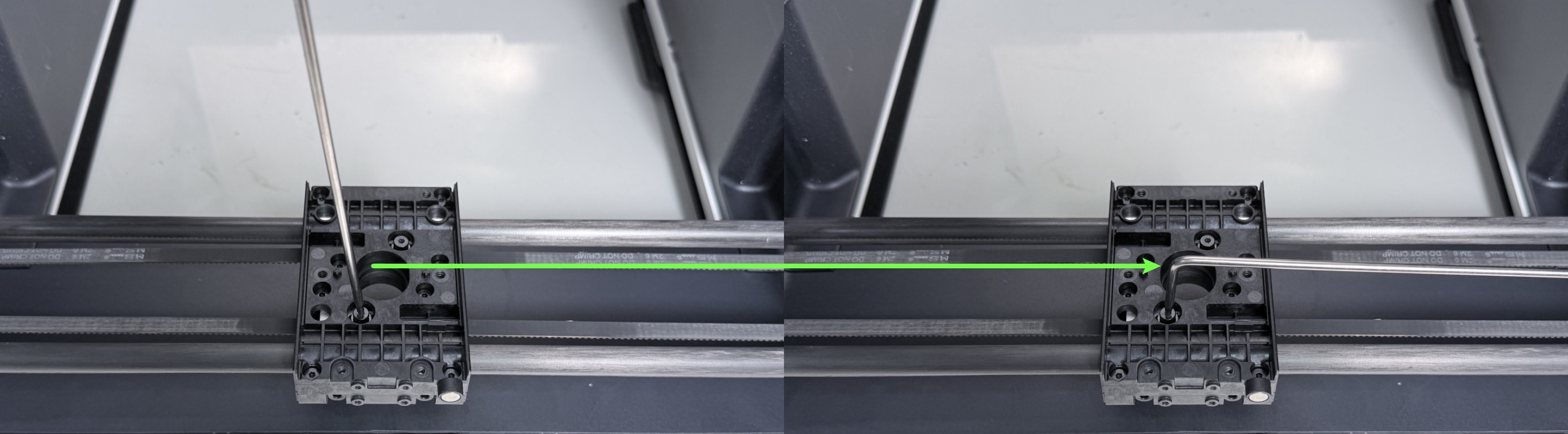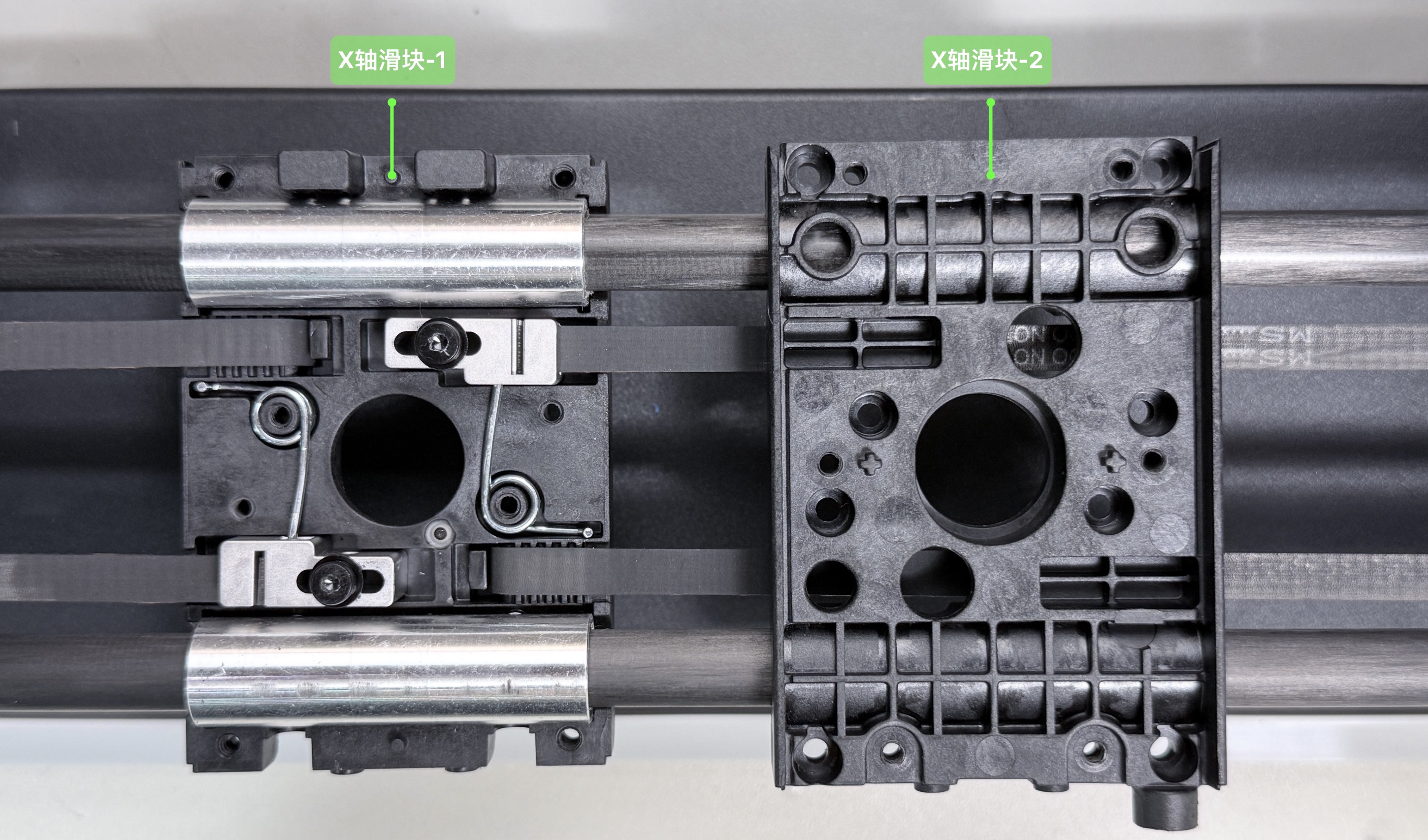 (1) 将X轴滑块-2盖在X轴滑块-1上,使用H2.0内六角扳手按对角线顺序将第6组螺丝依次预锁,最后再拧紧。