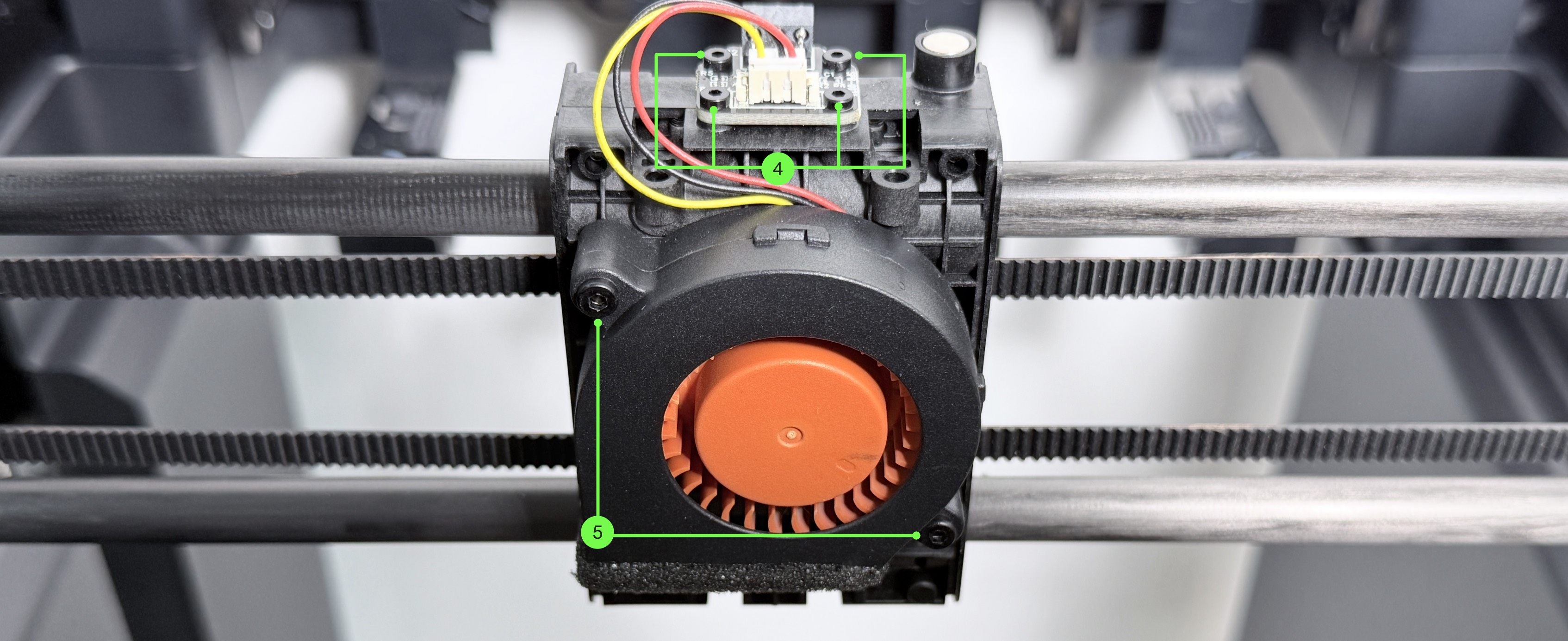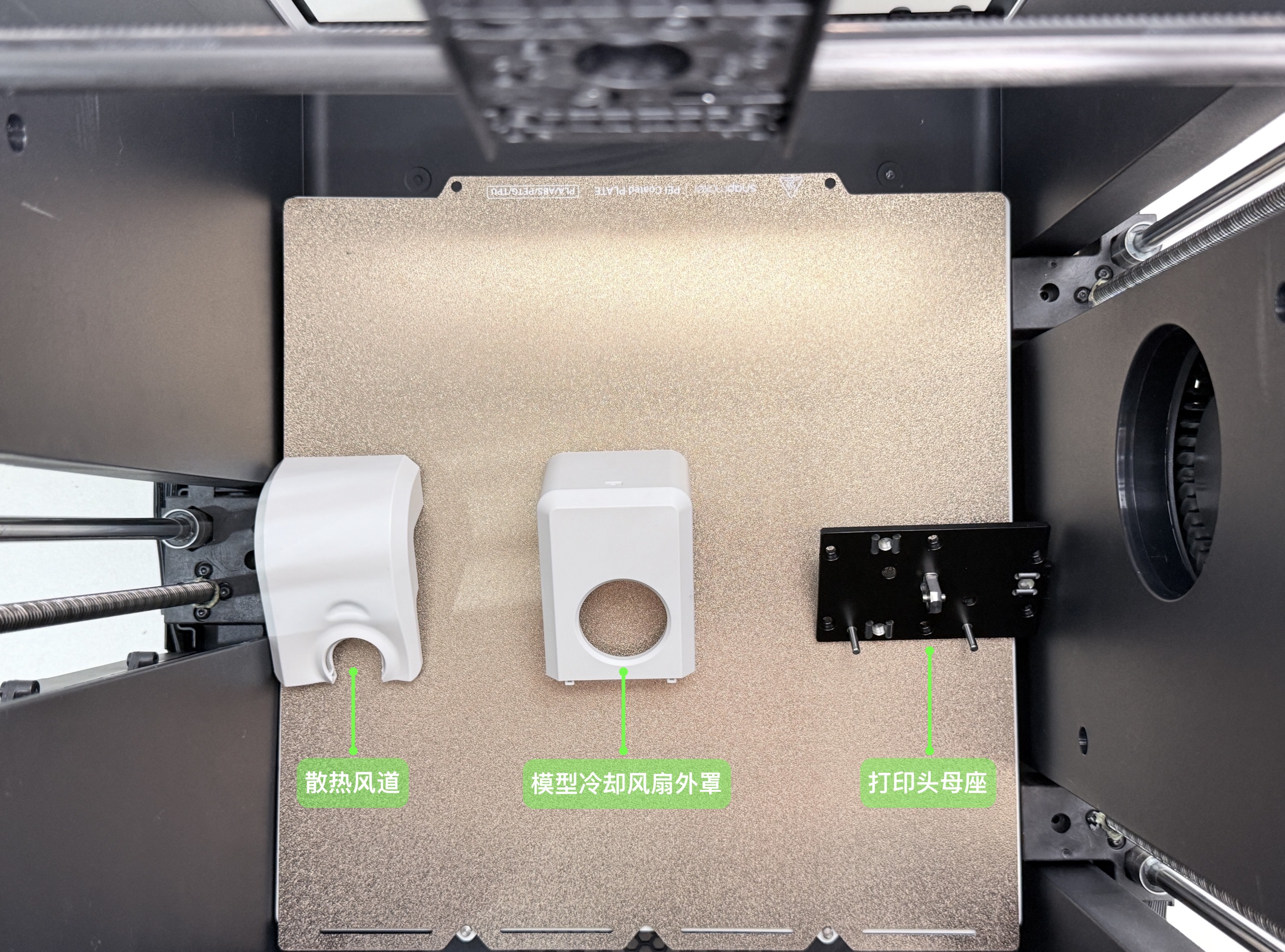 (3) 先安装打印头母座,使用H2.0内六角扳手锁紧第2组螺丝。再依次安装模型冷却风扇外罩、散热风道,锁紧第1组螺丝。
