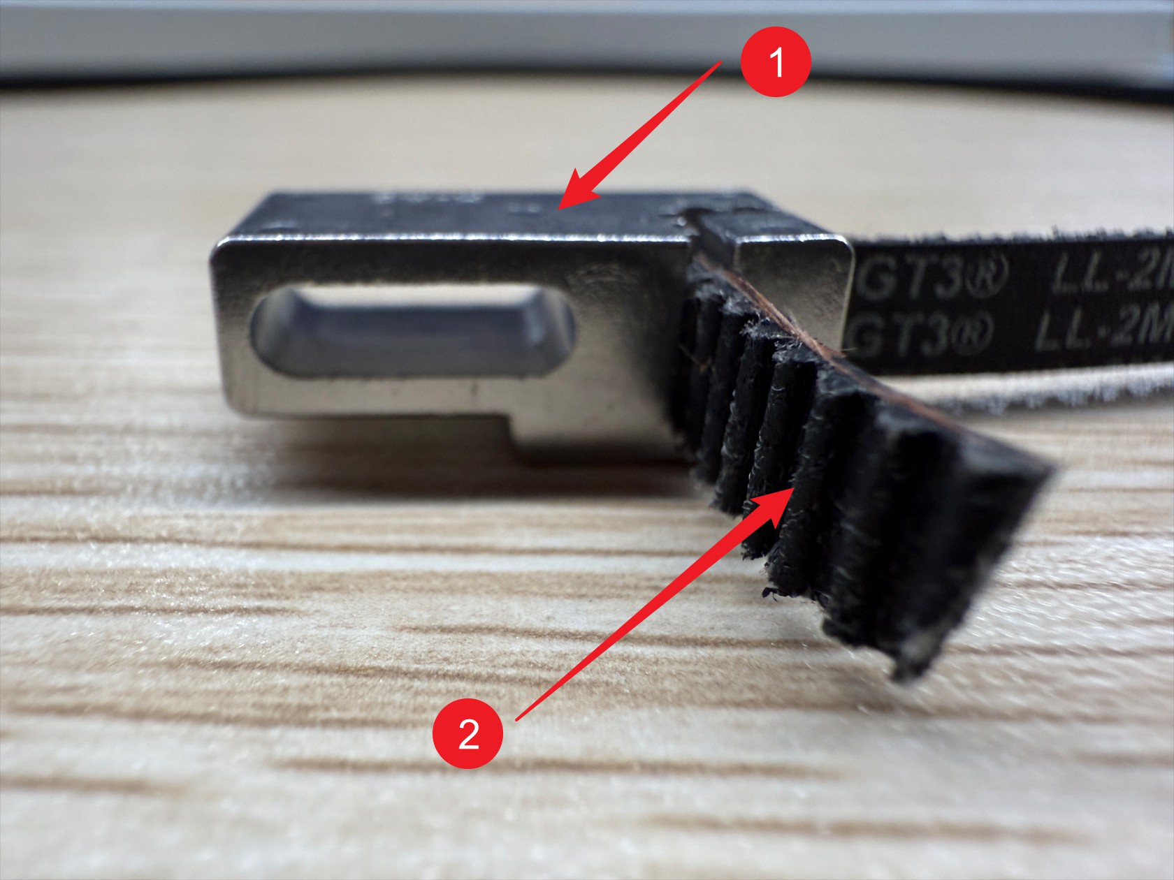 正对机器前面板,上方同步带的左端以及下方同步带的右端需要压进末端张紧活动块,同步带不得超出1处上表面,2处多余的同步带需剪掉